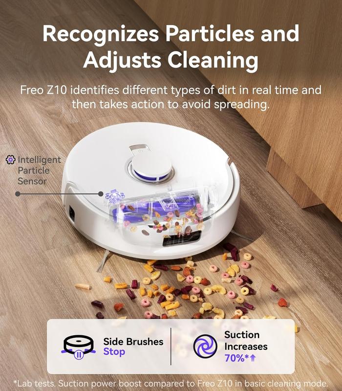 🟣DualFlow Tangle-Free System – Freo Z10 prevents tangles in both side and roller brushes. Dynamic side brush movements loosen hair, which is transferred and suctioned into the dustbin—minimizing maintenance.