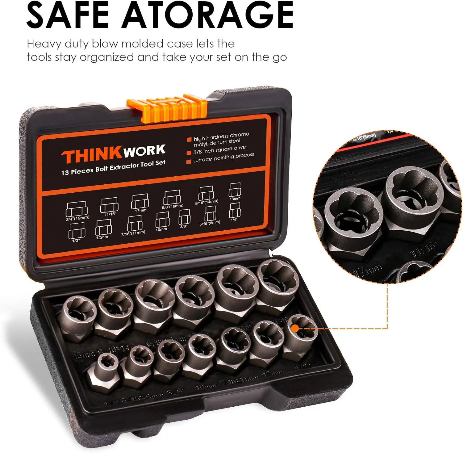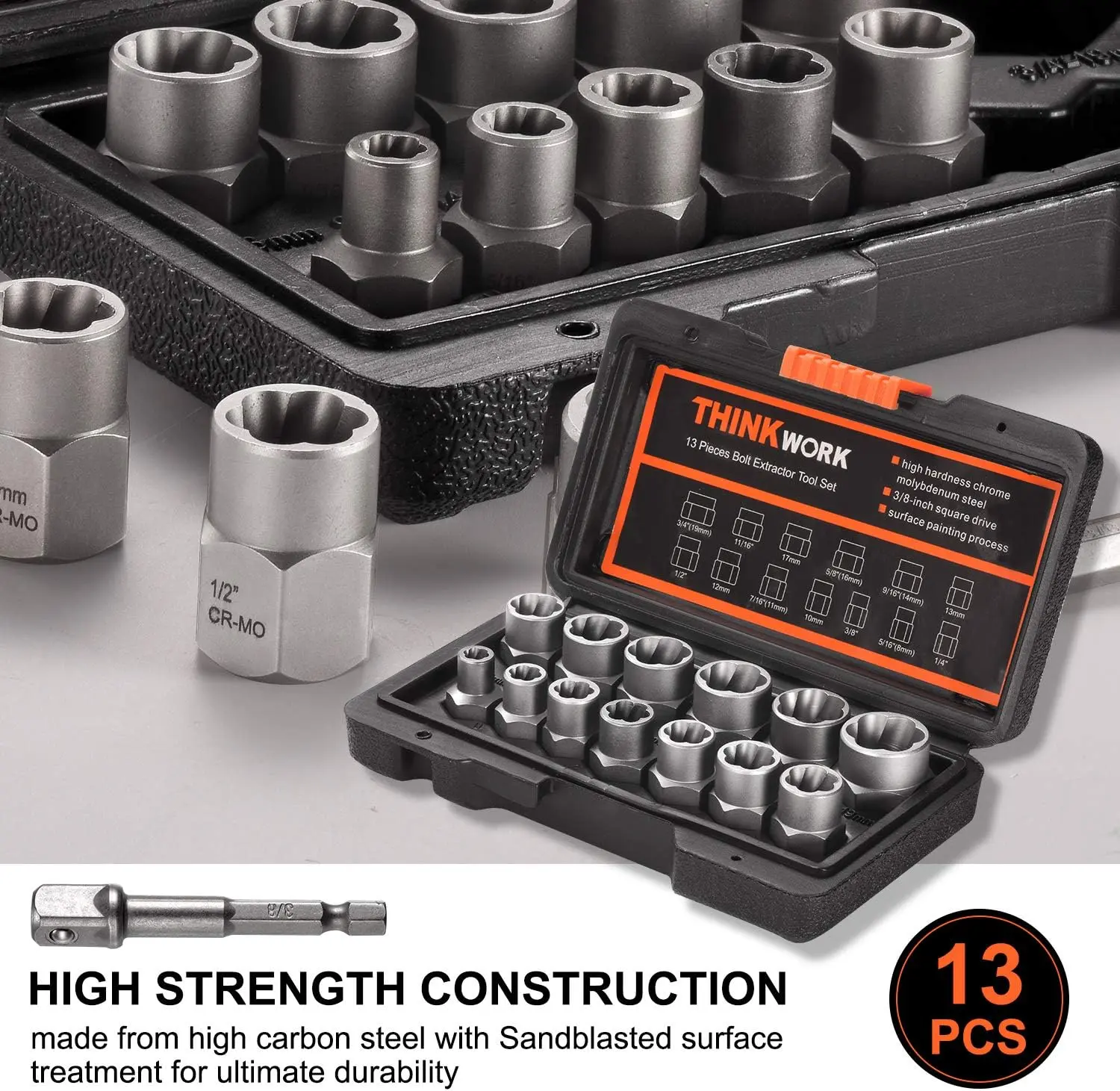 The THINKWORK Bolt Extractor Tool Set is a versatile and reliable tool set for removing damaged bolts, nuts, and screws. It includes a variety of sizes and is compatible with common to heavy-duty power tools. The heavy-duty blow-molded case ensures organized storage and easy carry. Contact us for any questions or concerns.