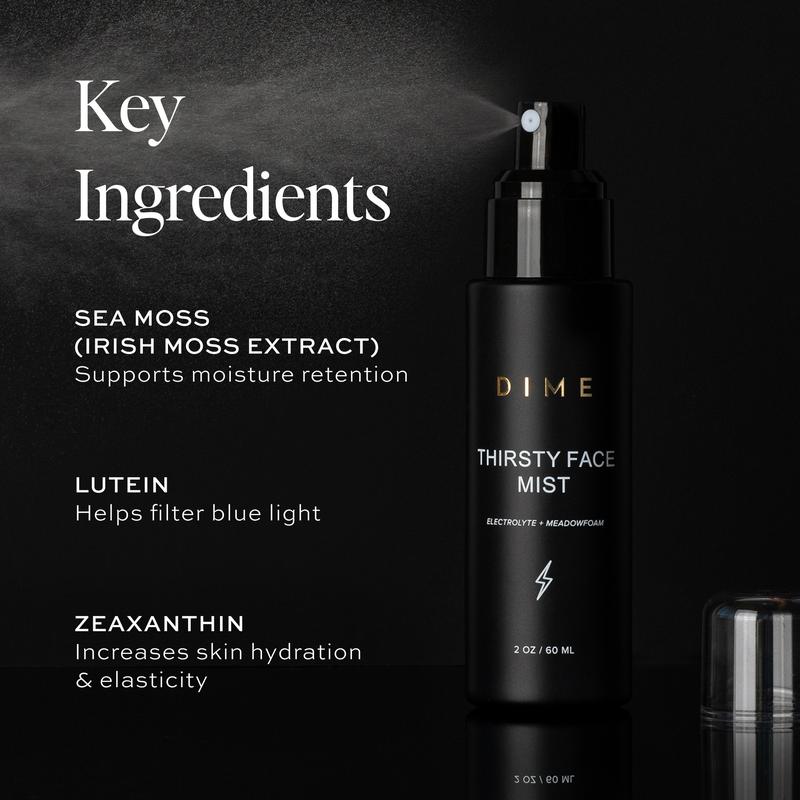 ·Overview: Rehydrate and protect your skin all day with Thirsty Face Mist®! Featuring an innovative blend of sea moss, lutein, and zeaxanthin, our refreshing mist penetrates the skin immediately to create a protective barrier that locks in moisture and filters harmful blue light. It also doubles as a primer and can enhance the performance of other products, revealing more luminous and glass-like skin. Ideal for home or on the go, Thirsty Face Mist is the perfect pick-me-up!