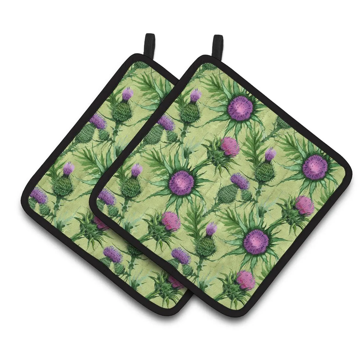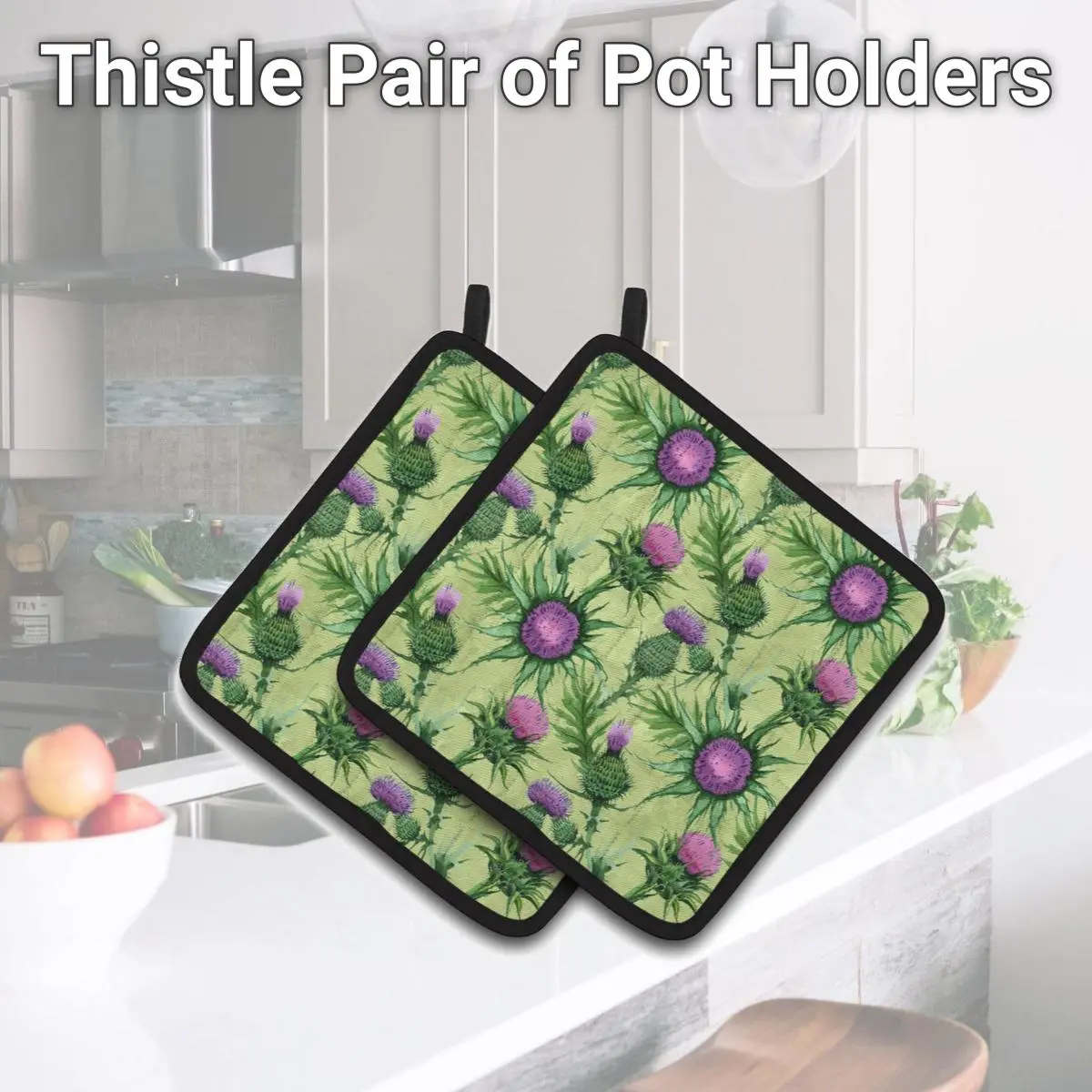 Thistle Pair of Pot Holders A Pair of Pot Holders to match your kitchen decor. Made in the USA these are thick and functional. Full color artwork decorates the front polyester fabric of the hot pad and accented by a black trim. Use these at as a trivet for your Thanksgiving or Christmas tablescape. Filled with insulated fabric and quilted for durability. These colorful pot holders will make a great gift for your favorite home cook or executive chef. Each pot holder measures approximately 7.5 inches by 7.5 inches. A hanging tab is inlcuded. Specifications Weight: 0.3 lbs.