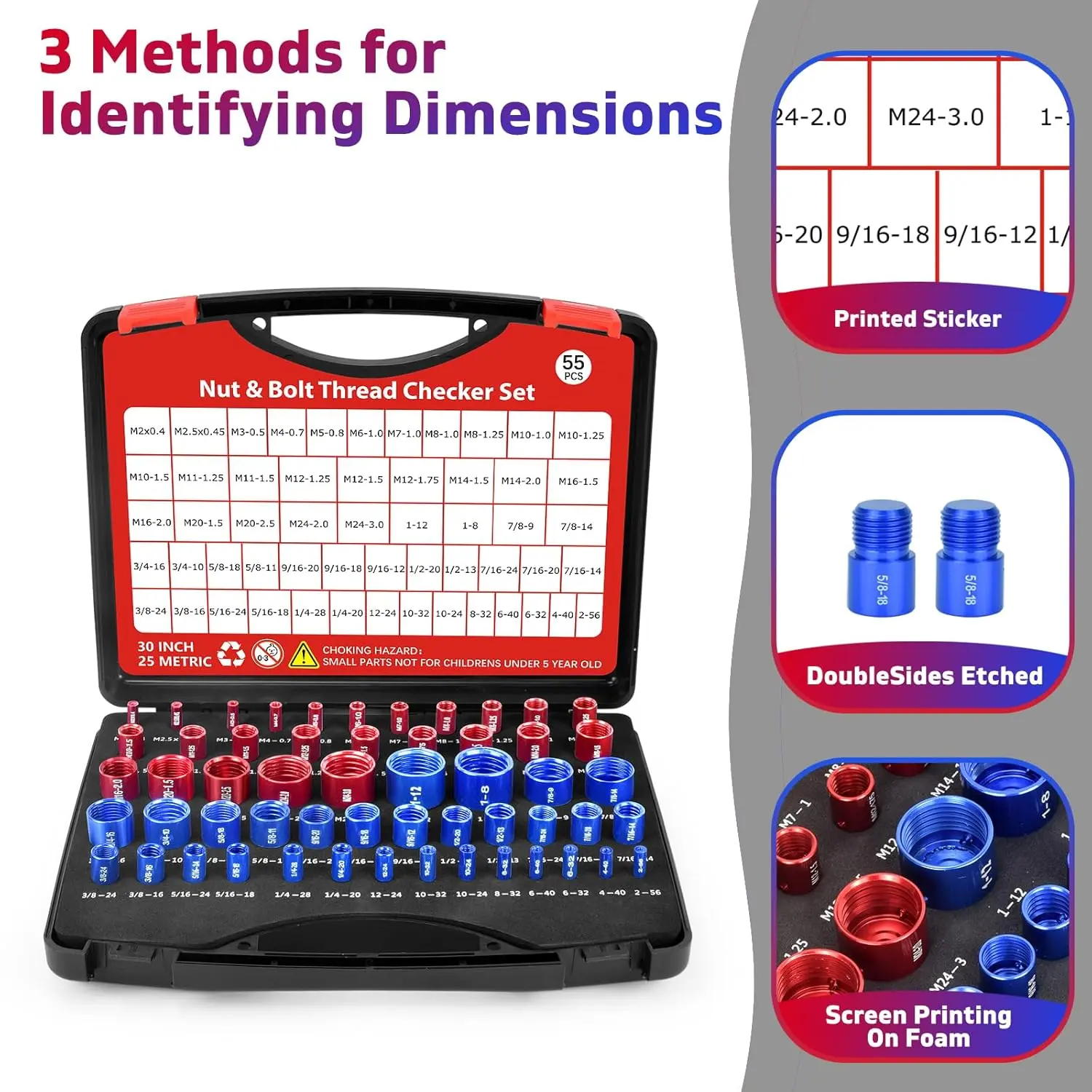 This 55-piece thread gauge kit includes 30 standard sizes and 25 metric sizes, allowing for quick and easy identification of screw sizes. Perfect for both professionals and DIY enthusiasts, this kit makes threading inspections seamless.