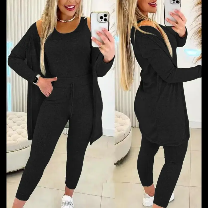 🌟 Three-piece Casual Suit Set This set includes a crew neck vest, long-sleeved cardigan, and sweatpants. Perfect for casual wear, it's crafted from 97% Polyester and 3% Elastane. The solid color design ensures versatility. No sheer material, suitable for all seasons. 🌞 Material and Care Style and Origin The set features a crew neck style and knit fabric. It's made in Guangdong, China. The fabric texture is consistent with the components listed. Ideal for everyday wear. 🌟