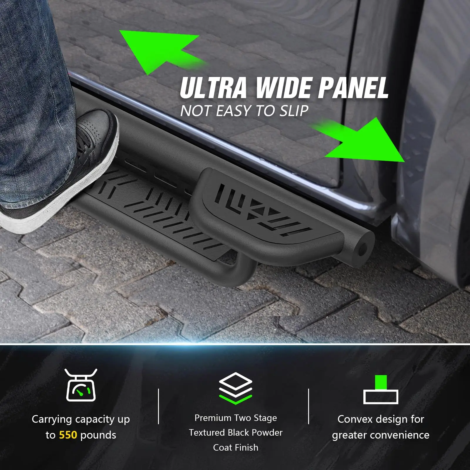 ·【Robust and Durable】: The high-quality black powder coating provides outstanding rust and corrosion resistance. Constructed from heavy-duty 2mm carbon steel, each side can withstand a weight of 550 pounds. Precision laser cutting and stamping techniques contribute to a non-slip step surface and enhanced traction.