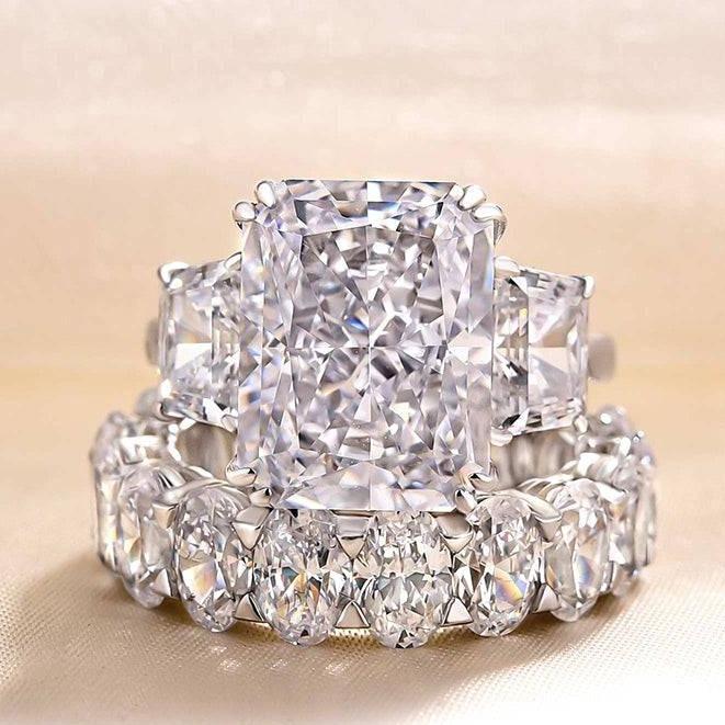The Effinny Three Stone Radiant Cut 8.0ct 2PC Wedding Ring Set features a stunning 8.0 carat radiant-cut center stone, flanked by two side stones for added brilliance. Crafted with elegance, this two-piece set offers both an engagement ring and a matching wedding band, creating a timeless symbol of love and commitment. Perfect for those seeking a luxurious and eye-catching design.