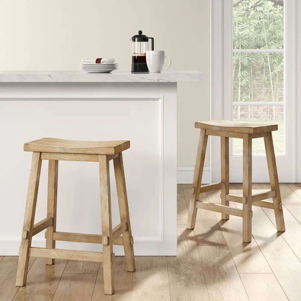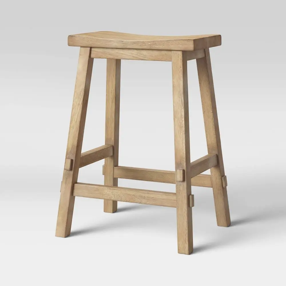 Enhance the look of any counter, high-top dining table or home pub with the functional simplicity of the Halifax Farmhouse Wood Counter Stool from Threshold. This 23.81-inch stool is constructed from solid, sturdy hardwood in a distressed finish, lending your space a touch of country-chic charm. It stands on four flared, square legs with foot rails for better stability, and is topped off with a curved seat for enhanced comfort and style. Plus, the backless and armless design offers a space-saving seating solution to any room.