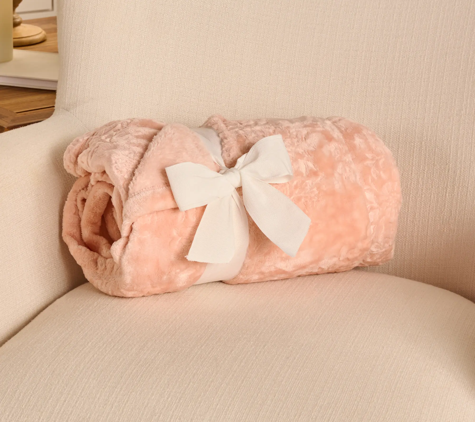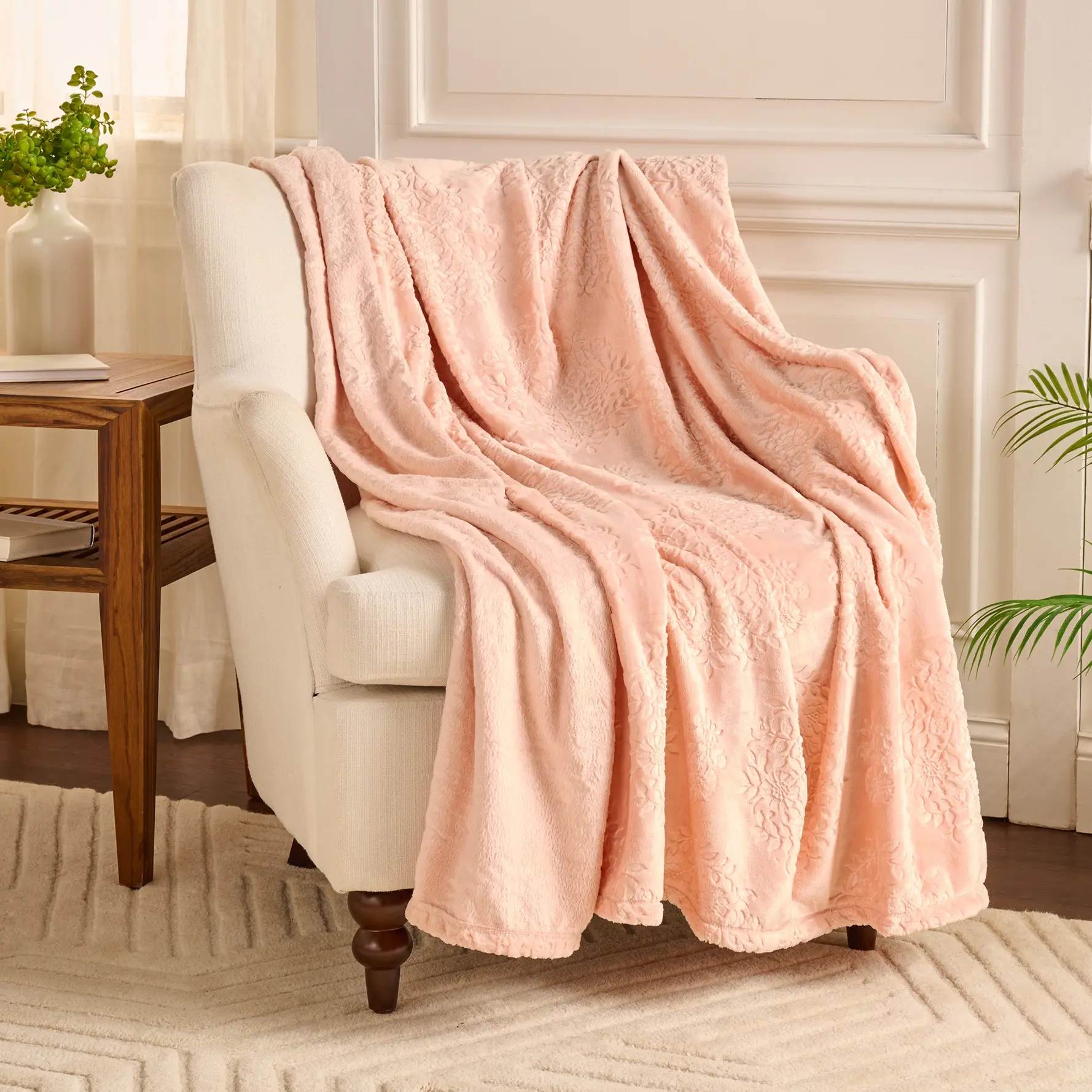 The sculpted floral print mixed with the velvety soft finish on this giant throw blanket from @QVC, Inc is so beautiful! Totally resisting my blanket obsession urge to order the yellow and blue! How gorgeous is this peach color!? #softblanket #cozyblanket #cozyathome #blanketlife #springdecor #homedecor #homedecortiktok