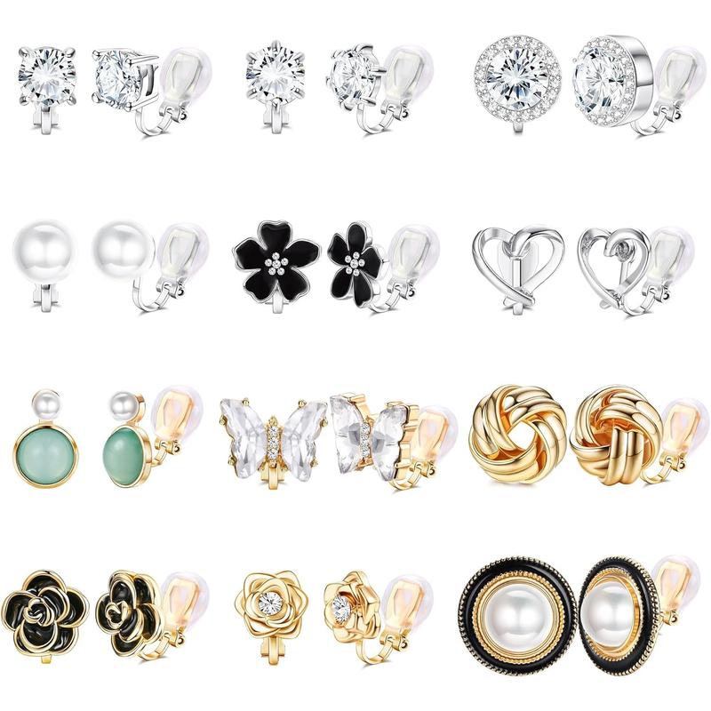 โจ Product Details: The set includes 12 pairs of ear clips. Each pair offers a unique design, from floral to golden knots. These non-piercing earrings are a great choice for those who love sparkling, non-tarnish jewelry. ๐ธ