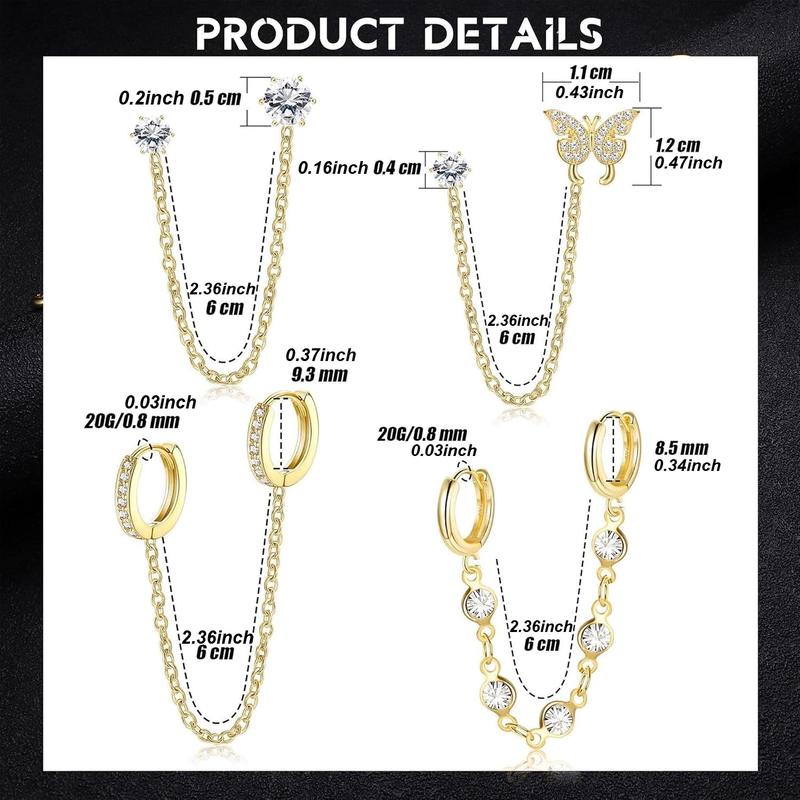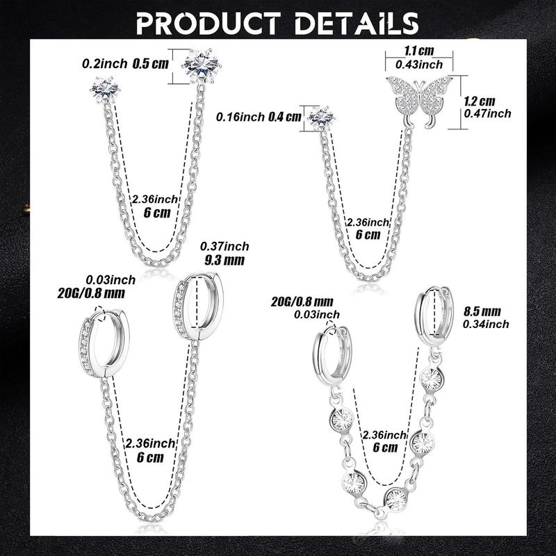 THUNARAZ 4 Pairs Trendy Double Piercing Butterfly Chain Earrings for Women Dangle Hoop Earrings Sparkled CZ Chain Hoop Cartilage Studs Earrings Set As Birthday Gifts for Best Friends Mother Trendy Style for Daily Outings Travel Christmas Gift