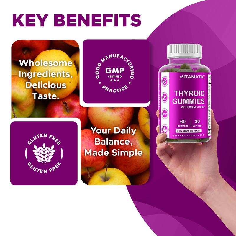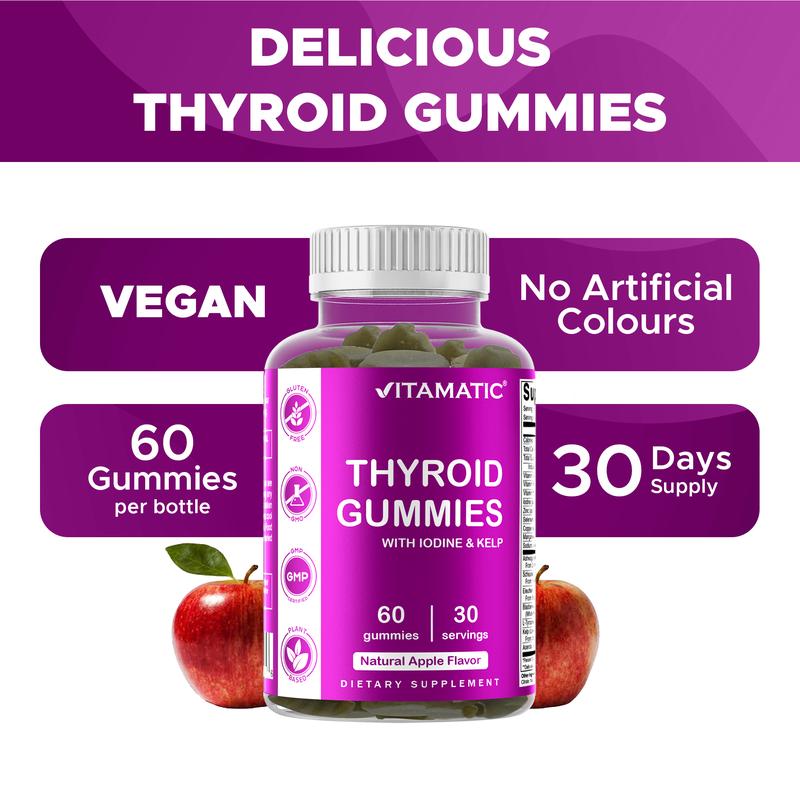 Enjoy the delightful apple taste of Vitamatic Vegan Thyroid Support Gummies. These gummies eliminate the unpleasant aftertaste from large thyroid support capsules, tablets, or pills. They make it easy to consume your daily dose of essential nutrients. Each gummy is crafted to enhance your energy and metabolism without the hassle.