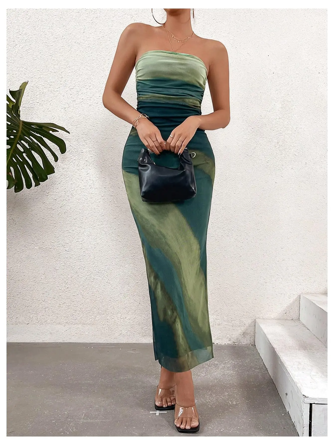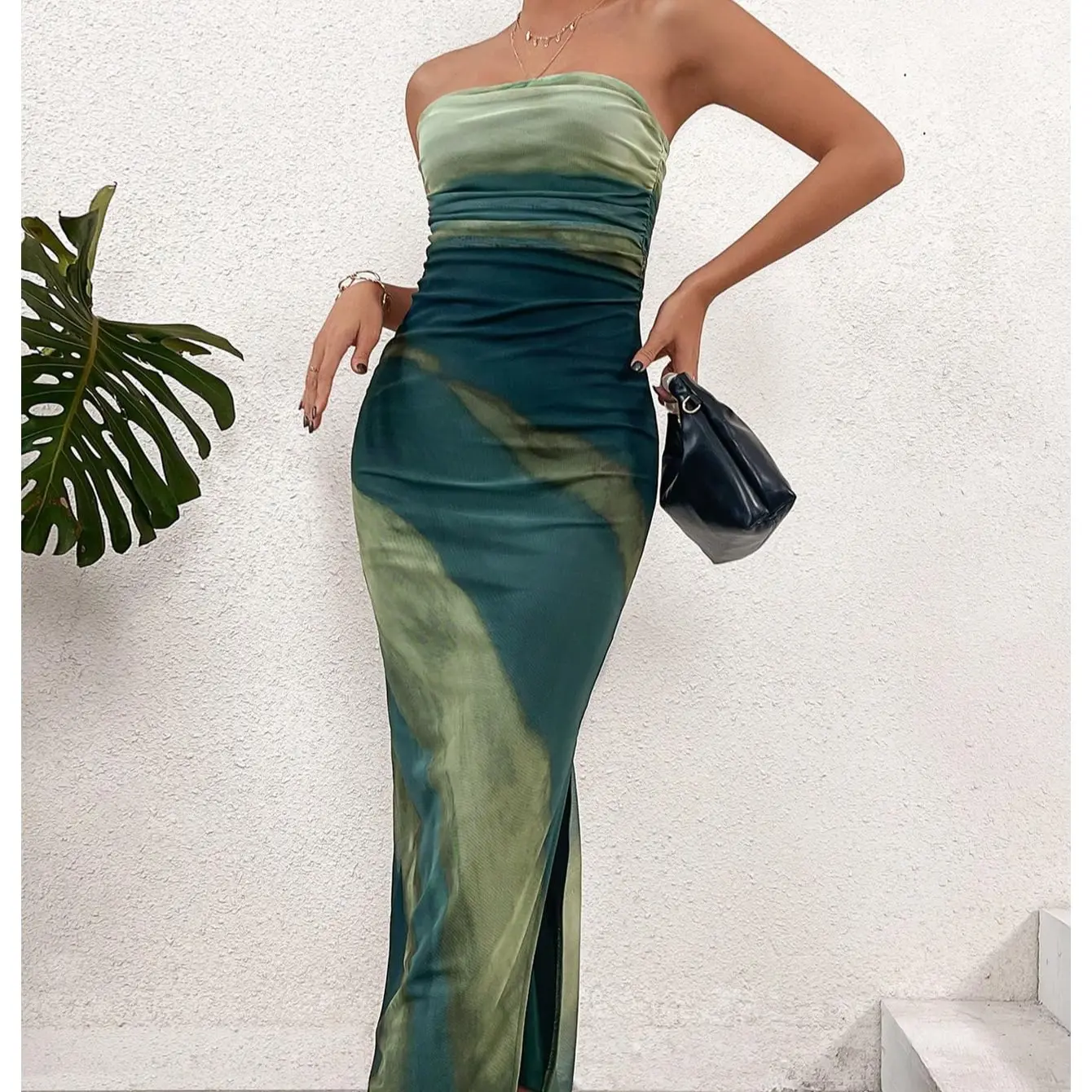 ·Feature: Ruched, Strapless, Split Hem, Sleeveless, Bodycon, Maxi Length, Elegant Bandeau Dress for Women