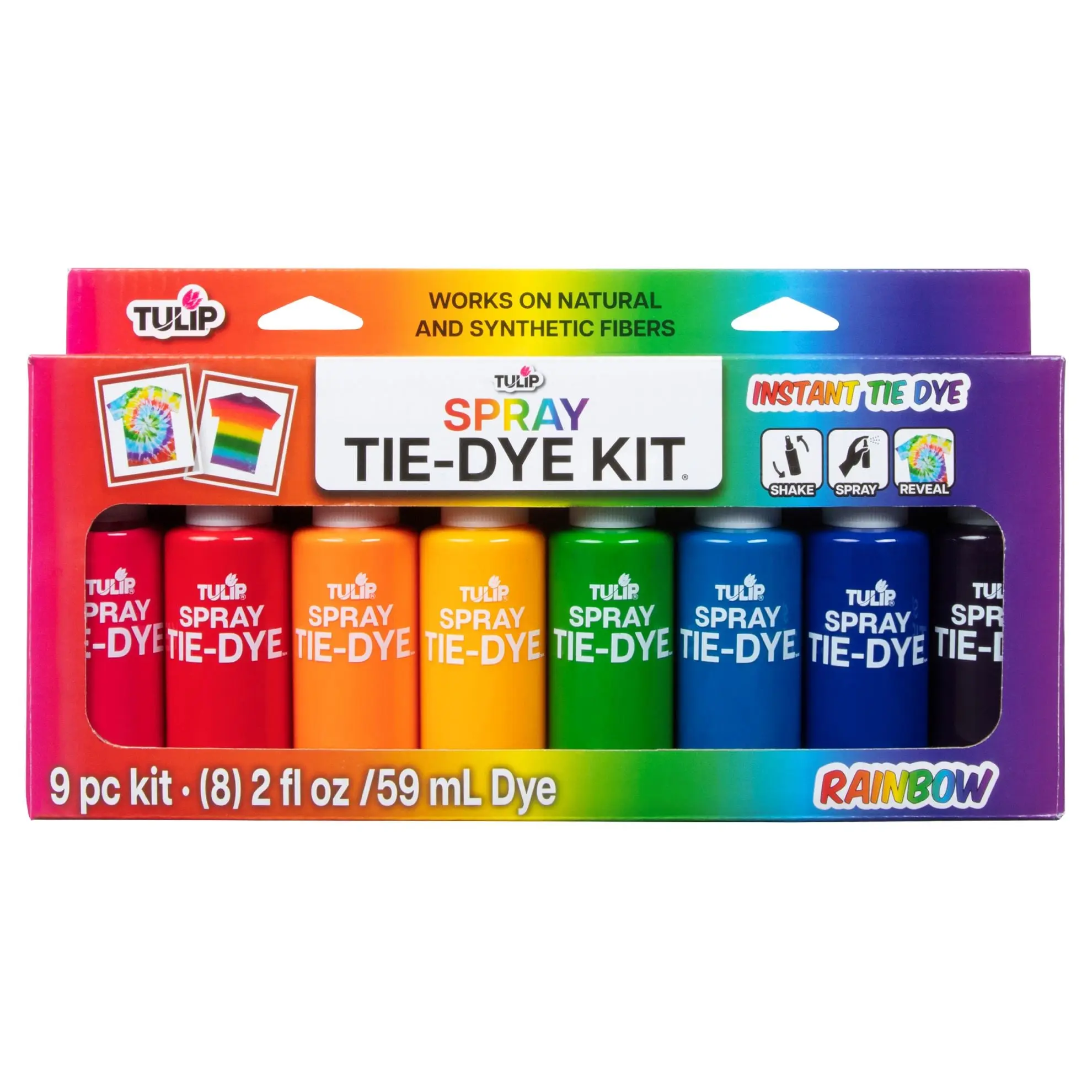 The Tulip Rainbow Spray Tie-Dye Kit includes 8 (2 fl. oz.) ready-to-use spray dyes in a classic rainbow palette (Red, Orange, Yellow, Green, Turquoise, Blue, Purple, Pink) plus project guide. Instantly add vibrant tie-dye color to your wardrobe— just shake and spray on the bold, beautiful color!