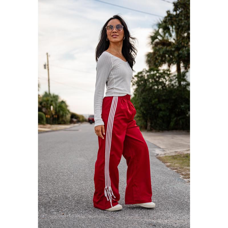 A bold yet wearable pop of red, these Tied to Perfection Red Side-Stripe Track Pants feature a relaxed fit with sporty side stripe detailing. Easy, comfortable, and statement-making, they’re perfect for balancing cozy knits with a playful Valentine edge. Pair with a sweatshirt, pullover, or basic top and sneakers, for an effortlessly comfortable look!