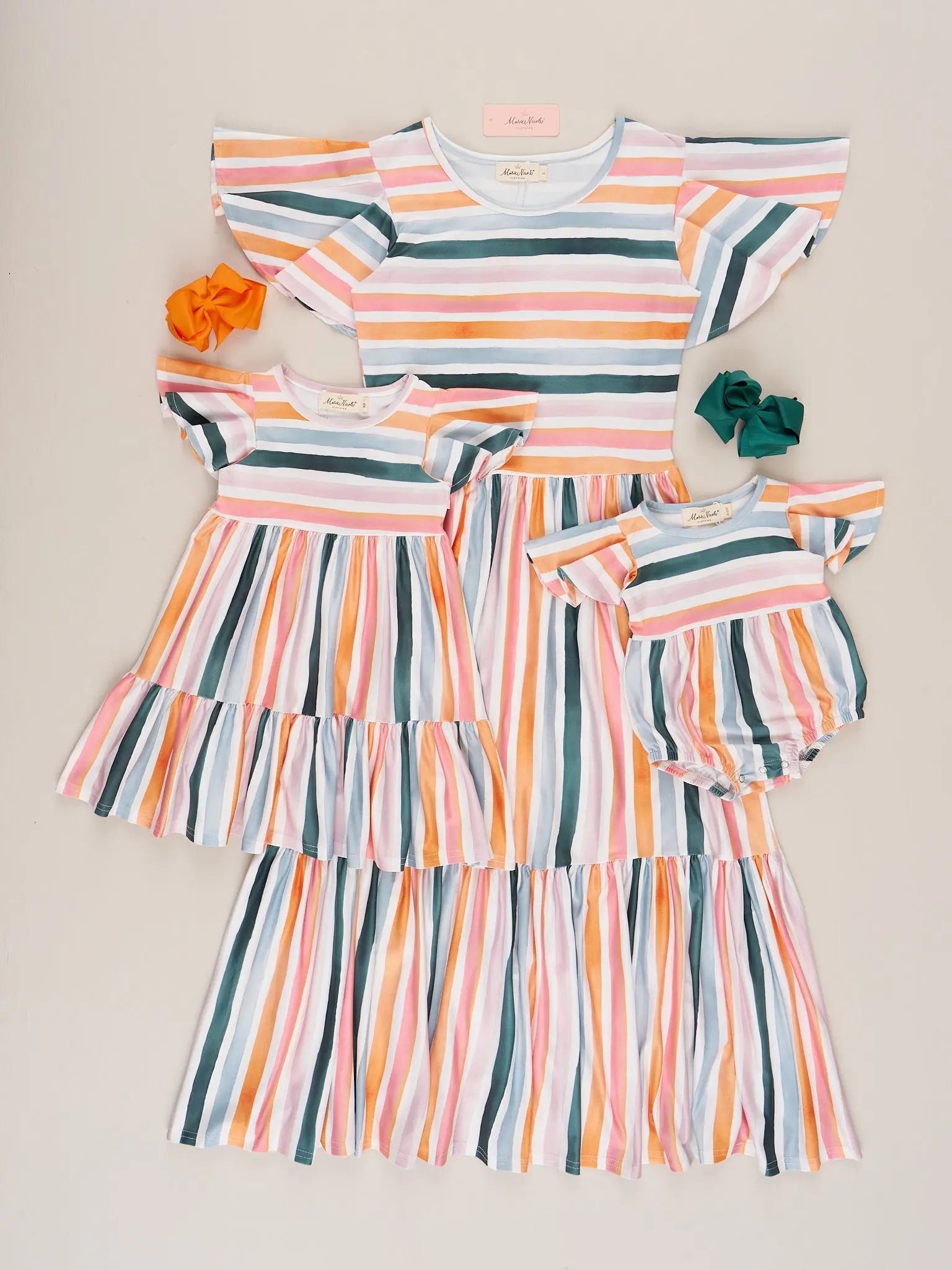 You've found the best family set for the spring! These tiered dresses feature the sweetest stripes & ruffle trim.