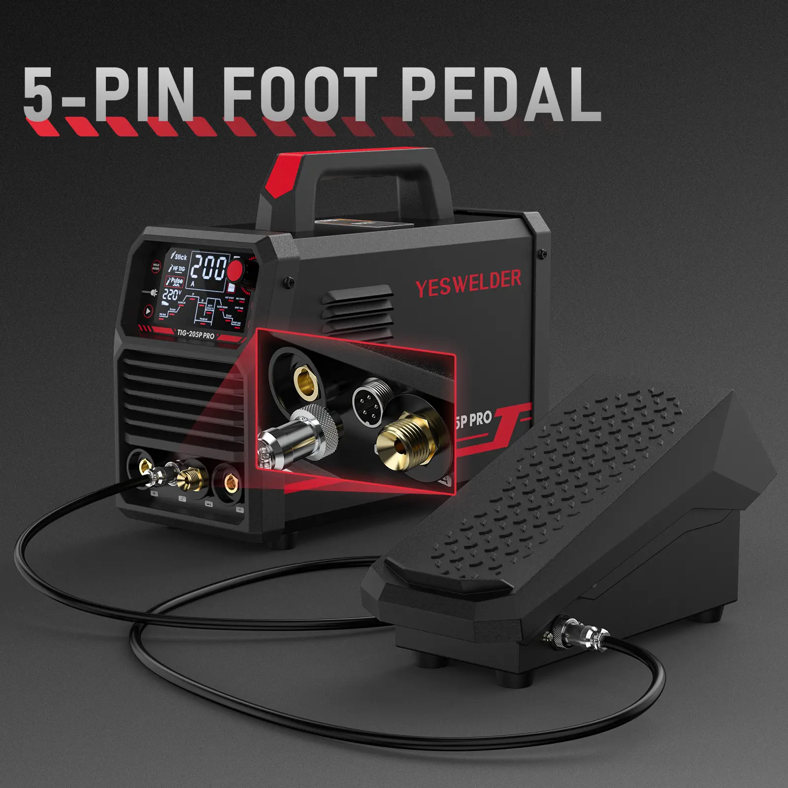 YesWelder FP-5P-B TIG Foot Pedal is specially designed for the TIG welder of YesWelder TIG-250P-PRO, TIG-200P-ACDC-PRO, CT-520, and other machines with 5-pin torch controls.