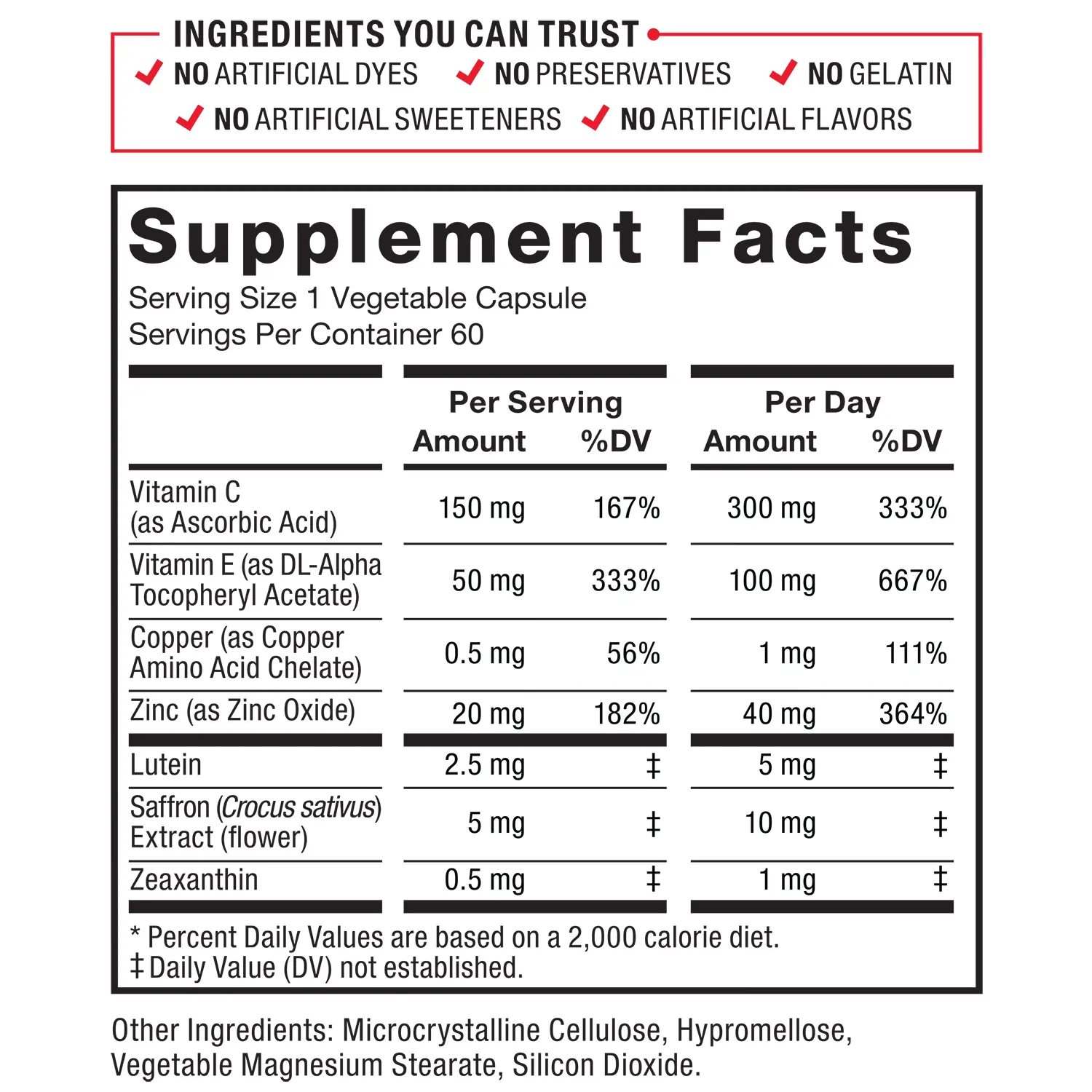 Ingredients You Can Trust, No Artificial Dyes, No Artificial Flavors, No Artificial Sweeteners, No Gelatin, No Preservatives. Supplement Facts: Serving size 1 Vegetable Capsule. Servings per container: 60. Amount per serving, %DV: Vitamin C (as Ascorbic Acid), 300 mg, 333%, 600 mg, 667% Vitamin E (as DL-Alpha Tocopheryl Acetate), 100 mg, 667%, 200 mg, 1333% Copper (as Copper Amino Acid Chelate), 1 mg, 111%, 2 mg, 222% Zinc (as Zinc Oxide), 40 mg, 364%, 80 mg, 727% Lutein, 5 mg‡, 10 mg‡ Saffron (Crocus sativus) Extract (flower), 10 mg‡, 20 mg‡ Zeaxanthin, 1 mg‡, 2 mg‡. *Percent Daily Values are based on a 2,000 calorie diet. ‡ Daily Value (DV) not established. Other Ingredients: Microcrystalline Cellulose, Hypromellose, Vegetable Magnesium Stearate, Silicon Dioxide