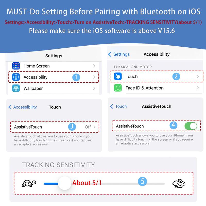 MUST-Do Setting Before Pairing with Bluetooth on iOS:Settings>Accessibility>Touch>Turn on AssistiveToch>TRACKING SENSITIVITY(about 5/1) Please make sure the iOS software is above V15.6