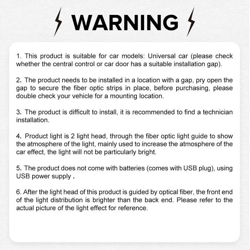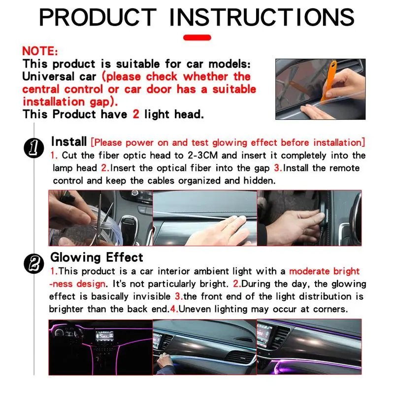 【Multiple Color Modes】: Feature a 5M fiber optic strip that displays multiple colors, offering a customizable ambiance in your car's interior.【USB Powered】: Easily power this LED light through a USB connection, compatible with most vehicles, providing convenient installation and use.【Car Interior Decoration】: Designed specifically for enhancing the car environment, it elevates the aesthetic appeal of your vehicle's interior.【Dual Control System】: Comes with a dual control setup allowing users to switch between colors and modes effortlessly, for personalized lighting.【Zero Battery Requirement】: Operates without a battery, ensuring there's no need for replacements or recharges, offering maintenance-free usage. Warning :1. Requires installation on a vehicle part with gaps. Check for suitable installation space before purchase. Use a pry tool for installation (moderate difficulty).2. Test the USB connector for power before installation.3. The product uses fiber optic strips to guide light, providing ambient lighting (not very bright). Refer to actual product images for lighting effects.4. Insert the light head into the fiber optic cable deeply (2-3 cm), ensuring it is straight and not bent.