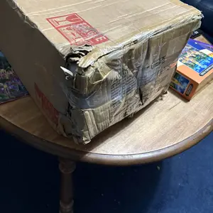 Box looked like it got beat up by something and retained to close it up again. Contents looked like they were just thrown in the box after being taken out of original packaging