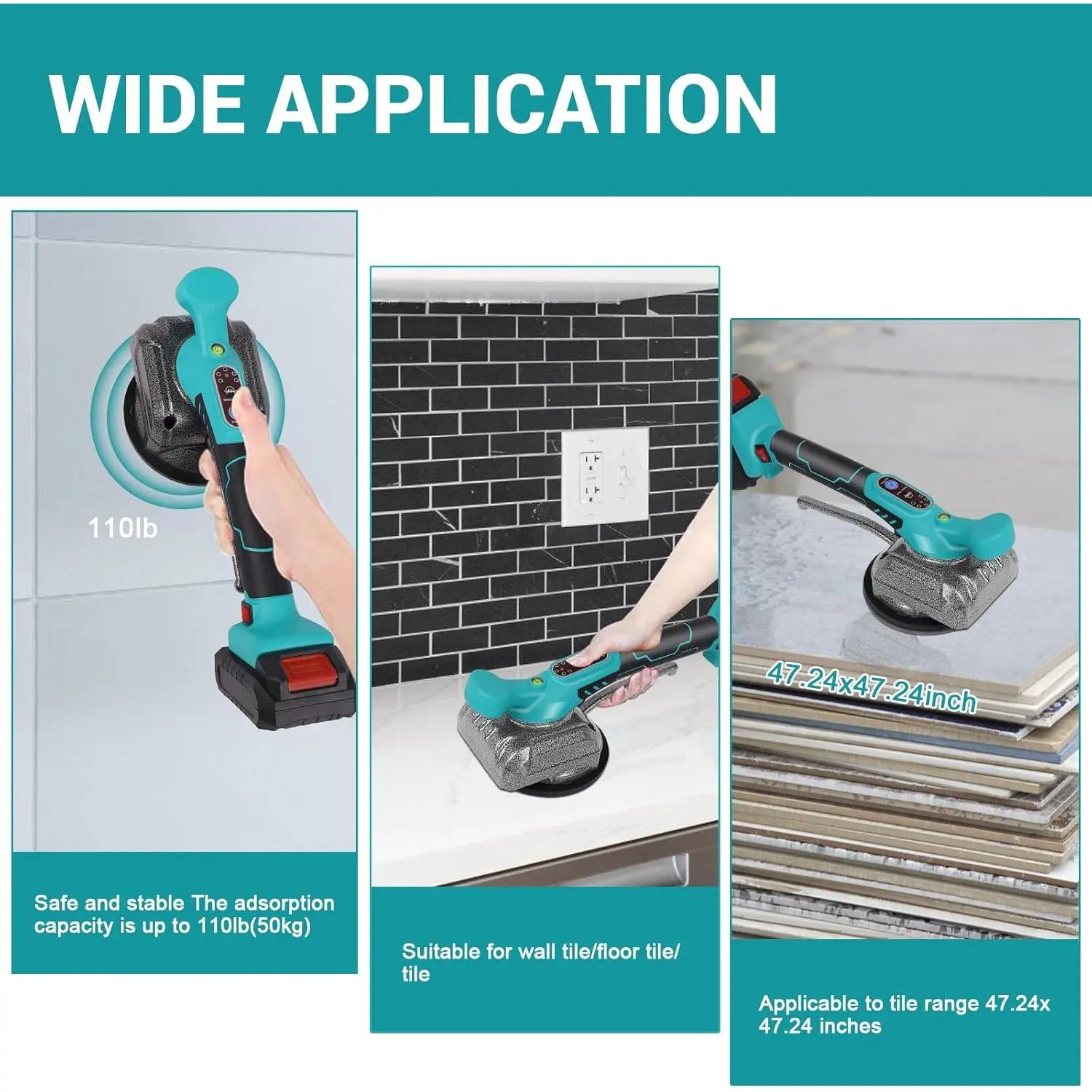Strong Suction Power: The 5-inch thickened tile suction cup vibrating tool have amazing suction power, allowing you to effortlessly pick up and install tiles weighing up to 110 lbs(50KG). Frequency:0-150hz.This makes moving and installing 8 - 47 inch wall/floor tiles a breeze, and you can even operate it with just one hand