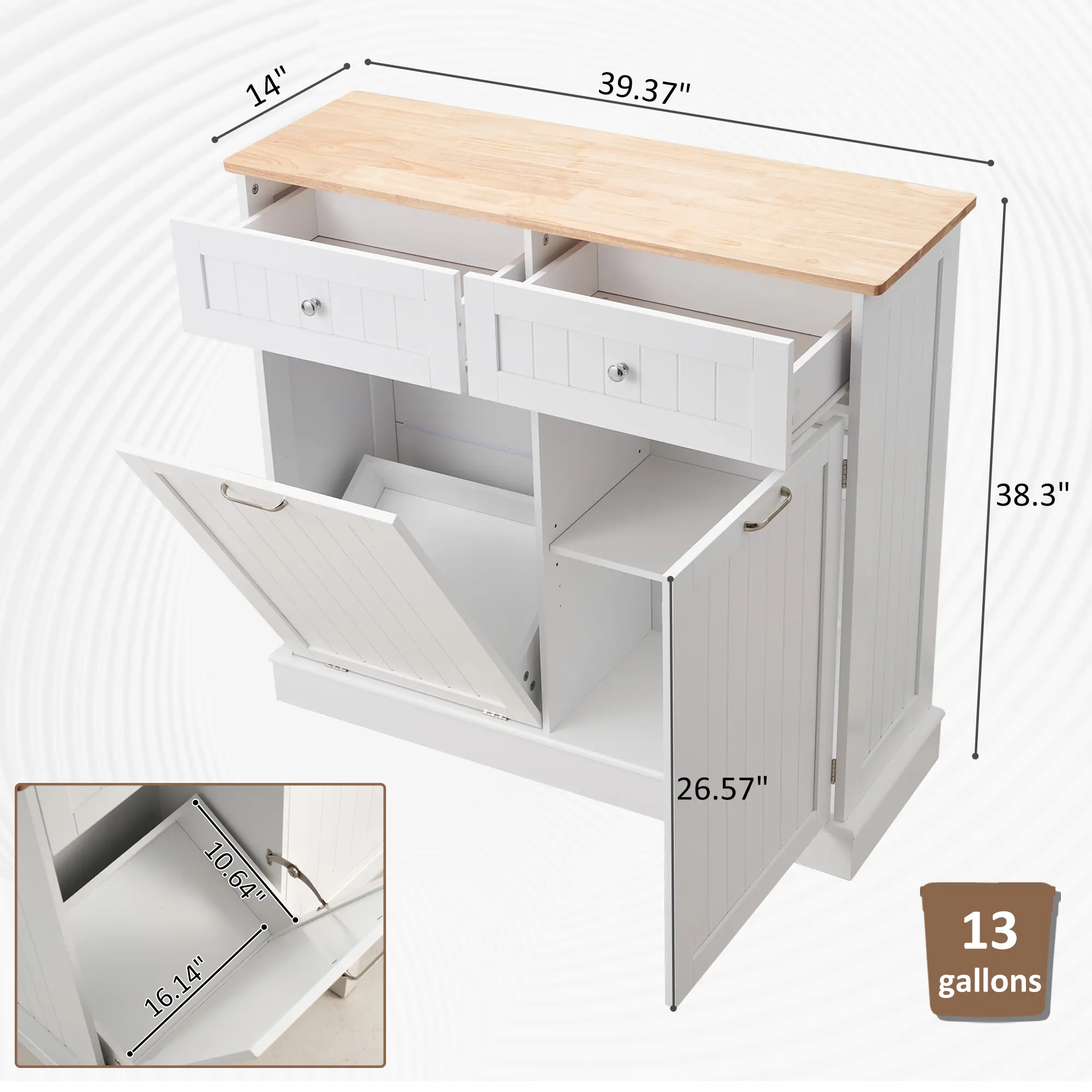 Made of MDF, this trash cabinet measures 39.37"L x 14"W x 38.3"H. It fits up to a 13-gallon trash can. The tilt-out design keeps the kitchen tidy. A movable shelf on the other side offers extra storage. Place your microwave or coffee maker on the tabletop. The cabinet is stable and easy to incorporate into various decor styles.