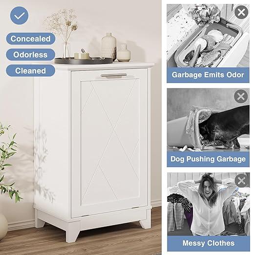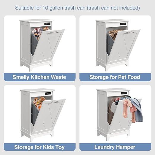 Versatile Storage: Our tilt out trash cabinet is the perfect addition to any kitchen, home, apartment, dormitory, or laundry room. It provides ample storage space for kitchen waste, supplies, pet food, and more. Additionally, it can be used as a laundry cabinet, with the top surface ideal for displaying decorations and daily essentials.