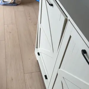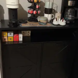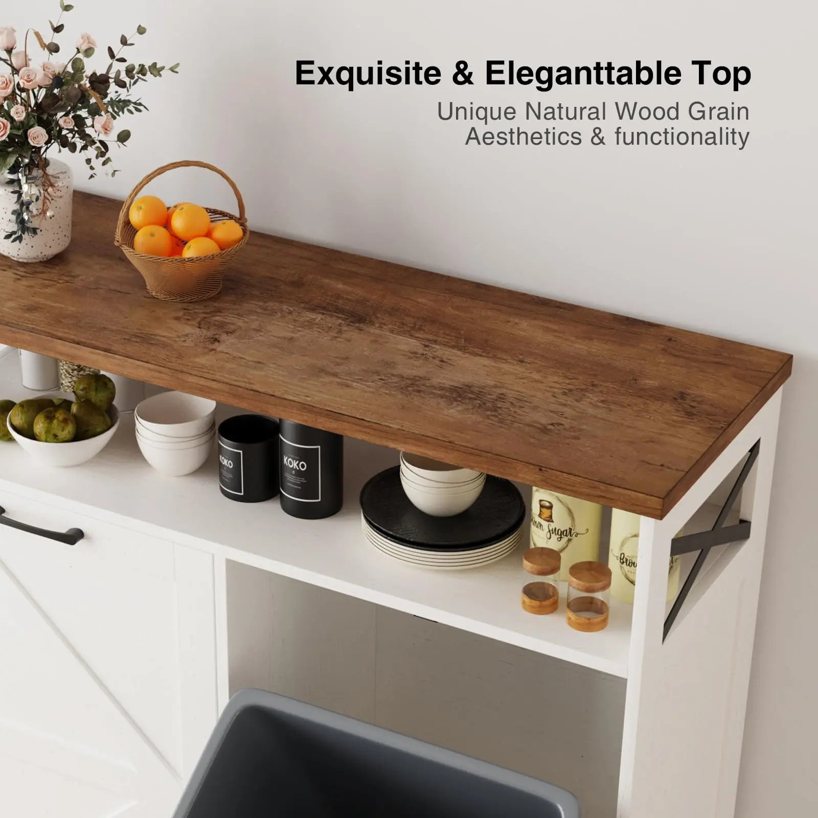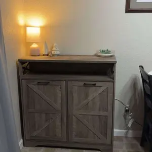 Consists of two barn doors and open shelves, this is such a utility cabinet that you can store pet food, the top can be used to place decorations, daily necessities, it can also be used as a trash can cabinet in the kitchen, or a dirty laundry basket cabinet in the bathroom.