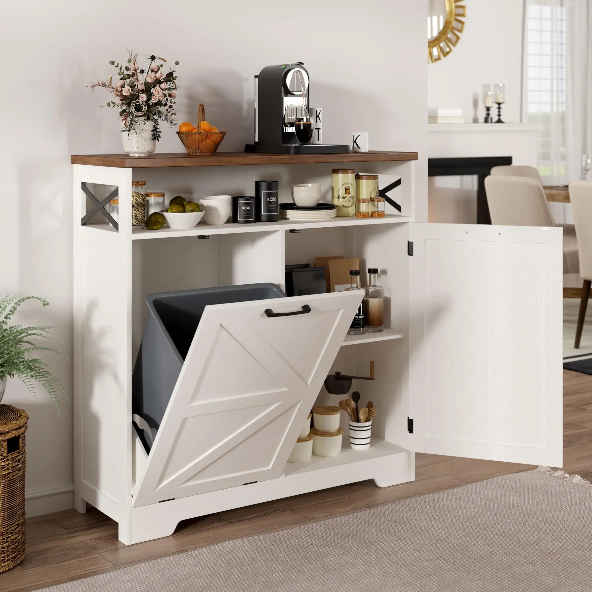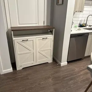 ·Modern Style Design: Featuring white as the main color tone complemented by smooth lines, this farmhouse tilt-out trash cabinet combines simplicity and fashion. The wooden texture with subtle natural grain adds a rustic farmhouse charm, blending effortlessly into any home decor and bringing warmth and elegance to kitchens, living rooms, or laundry rooms.