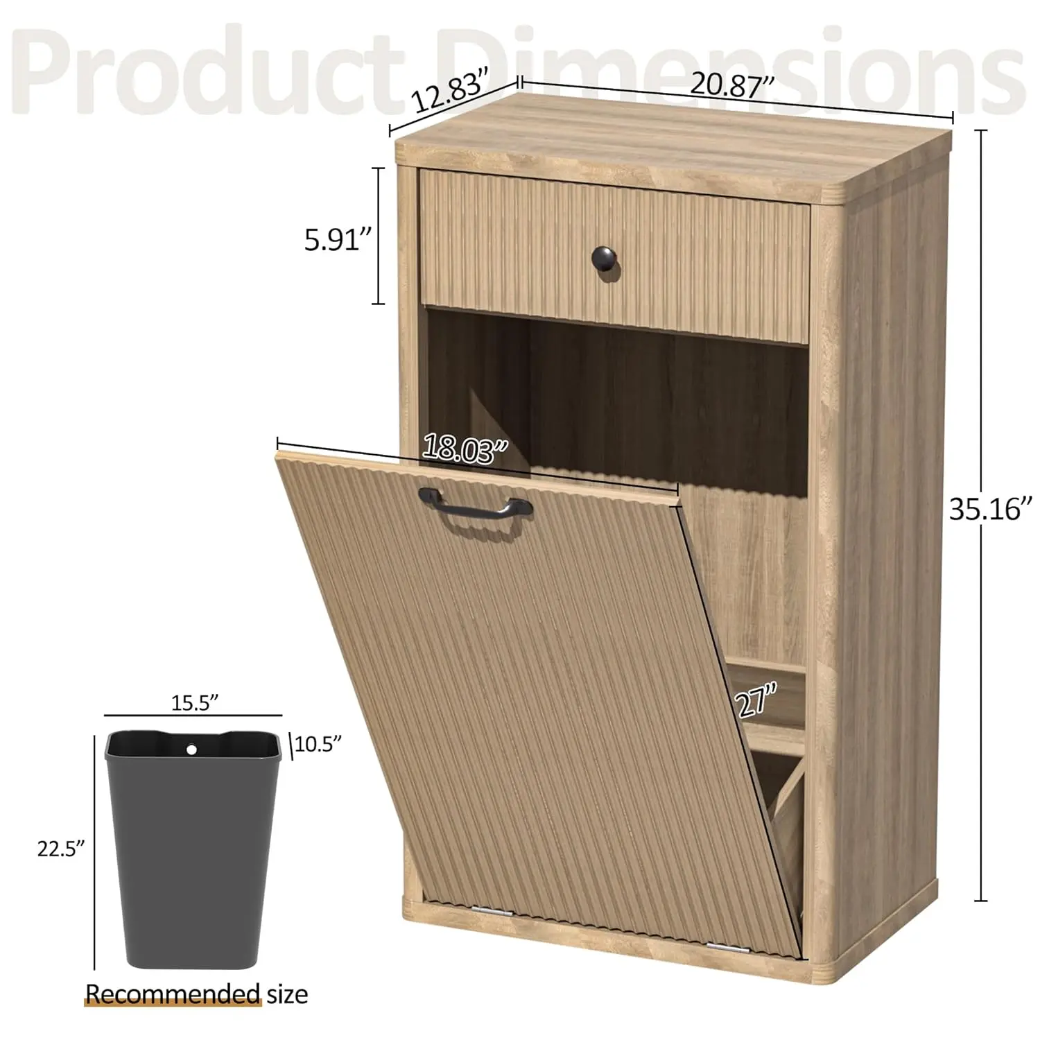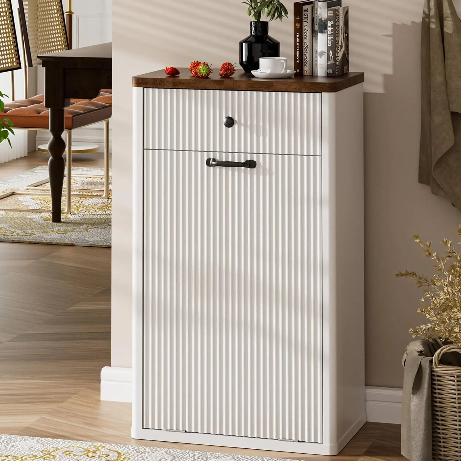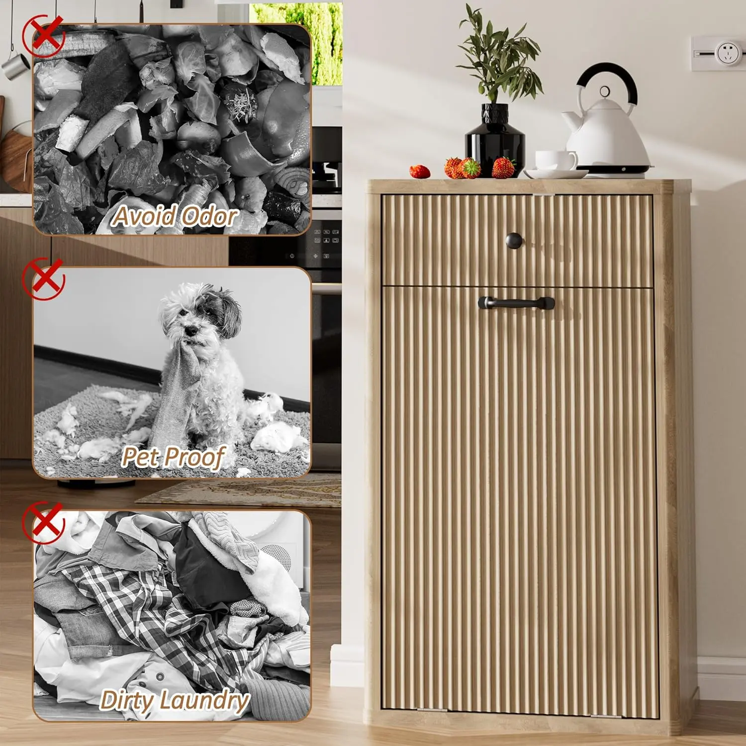 ·Modern Trash Can Cabinet: Tilt out trash cabinet is simple and practical. The unique fluted panels enhance the texture and boosting visual appeal. It can be easily incorporated into a variety of decorating styles. Perfect for dressing up your kitchen, living room, bathroom, dorm room, etc. It also can be used as a kitchen island and suitable to store dog food, cat food, etc.