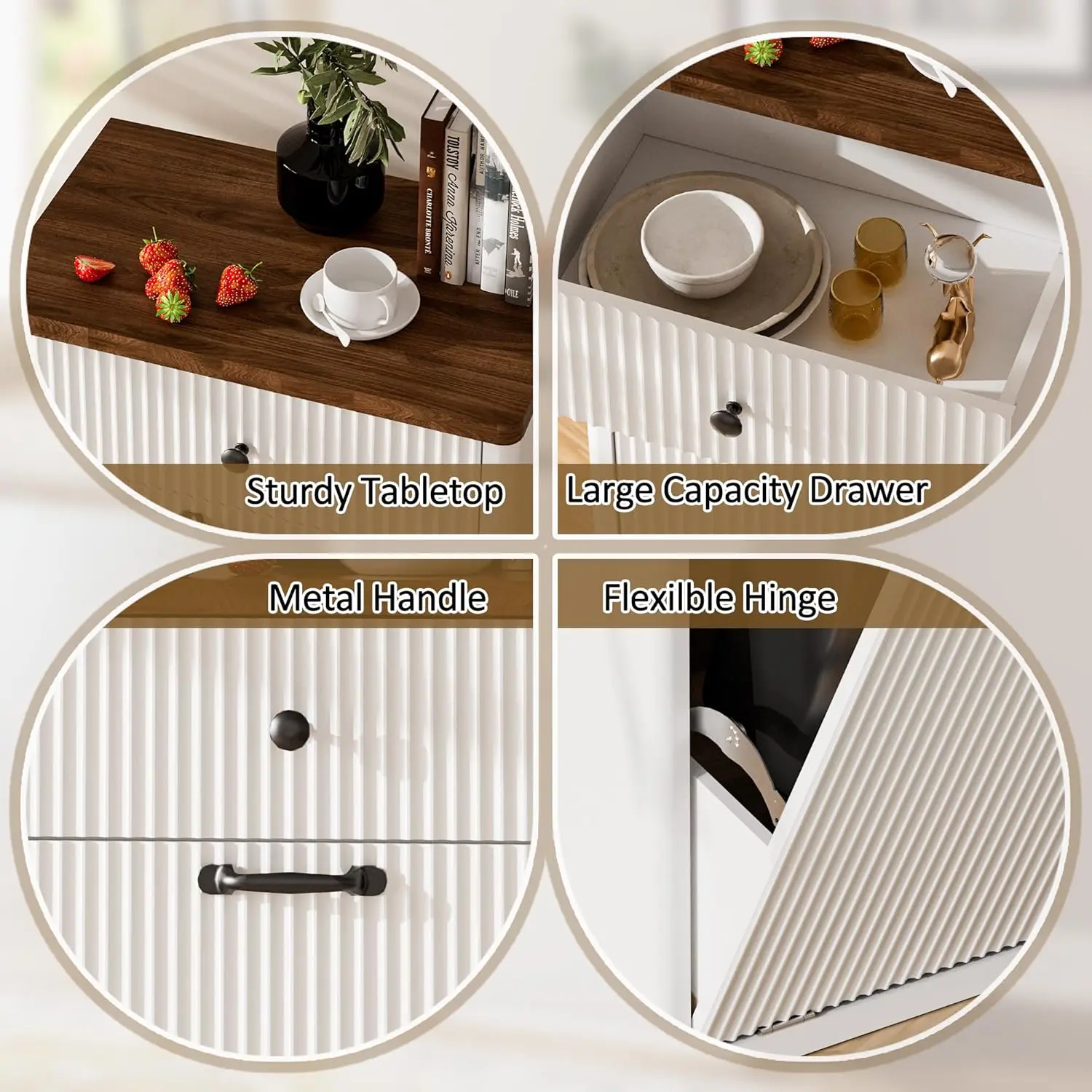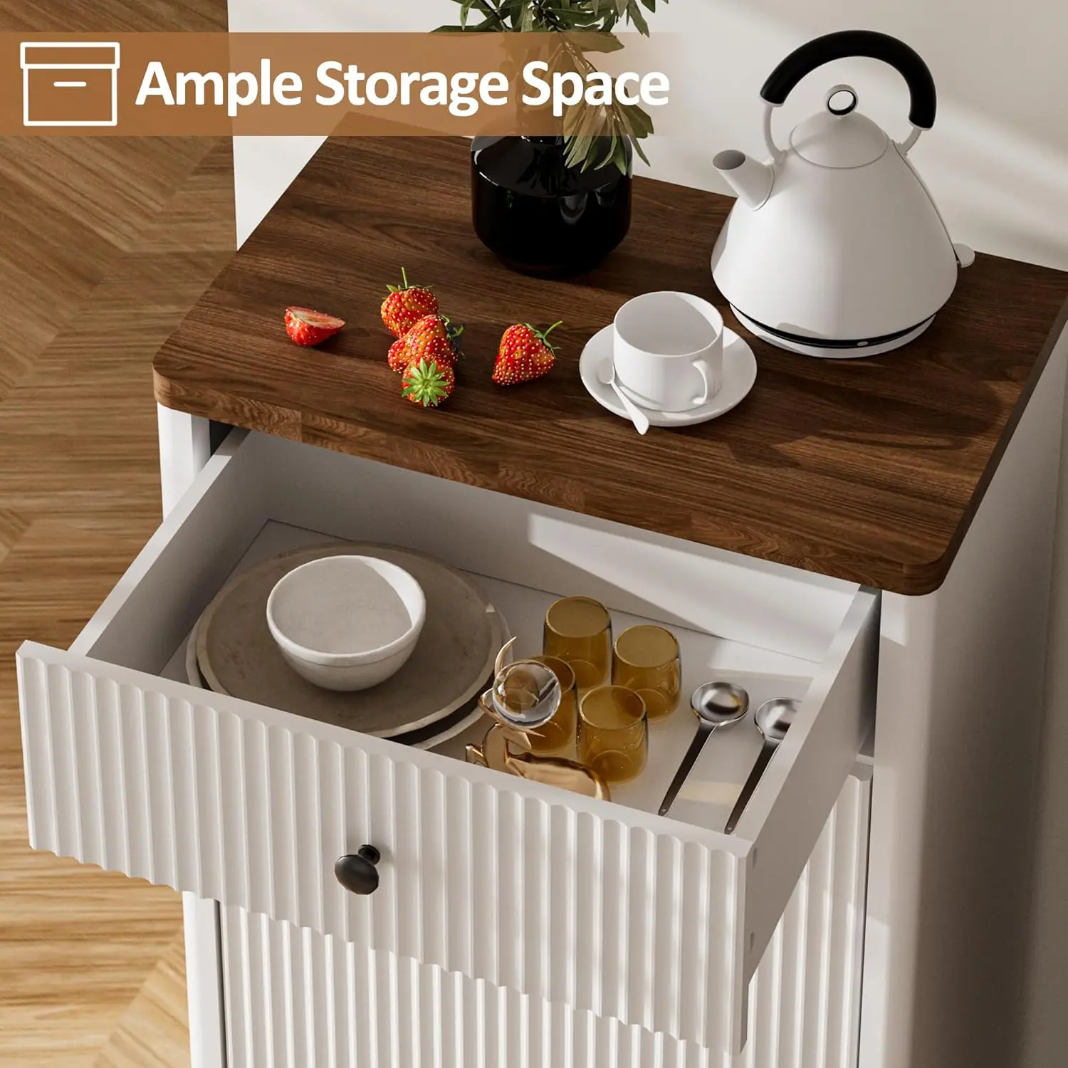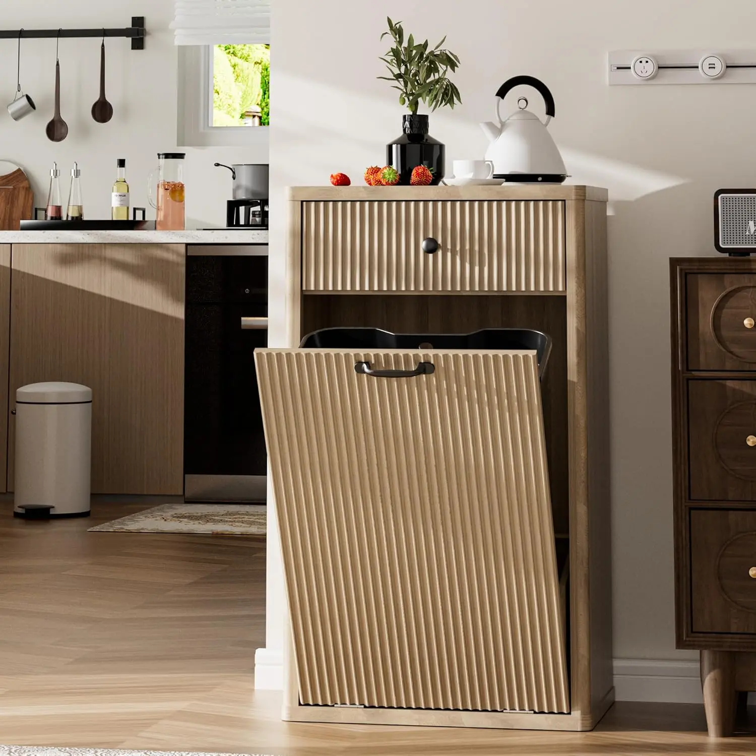·Modern Trash Can Cabinet: Tilt out trash cabinet is simple and practical. The unique fluted panels enhance the texture and boosting visual appeal. It can be easily incorporated into a variety of decorating styles. Perfect for dressing up your kitchen, living room, bathroom, dorm room, etc. It also can be used as a kitchen island and suitable to store dog food, cat food, etc.