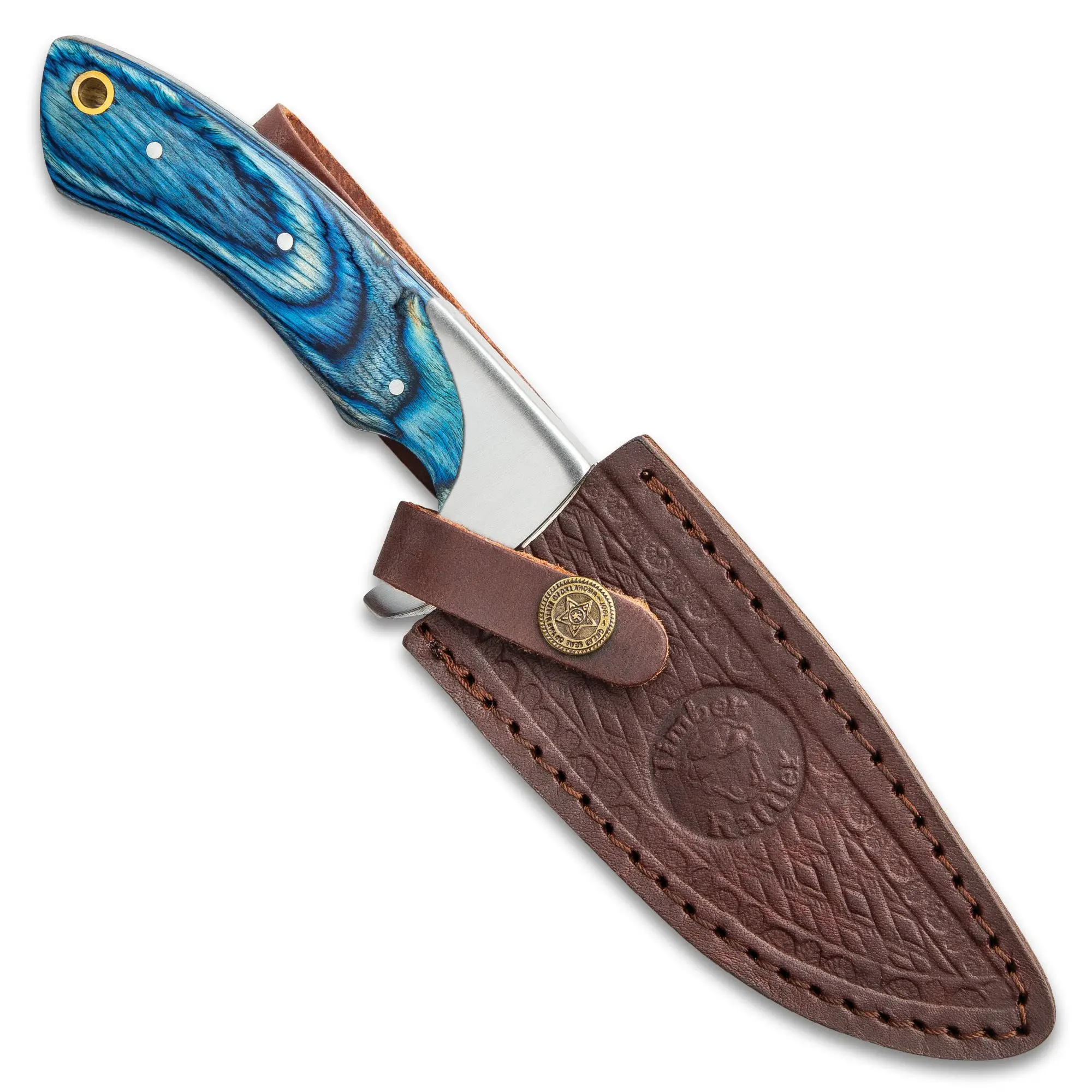 STAINLESS STEEL BLADE: Full-tang 4 7/8"" blade built for clean, controlled cuts.BLUE PAKKAWOOD HANDLE: Features a striking finish with brass pin accents.GENUINE LEATHER SHEATH: Premium leather with snap closure for secure carry.10"" OVERALL LENGTH: Designed for balance, comfort, and grip during use.DURABLE BUILD QUALITY: Crafted for outdoor performance and long-term use.