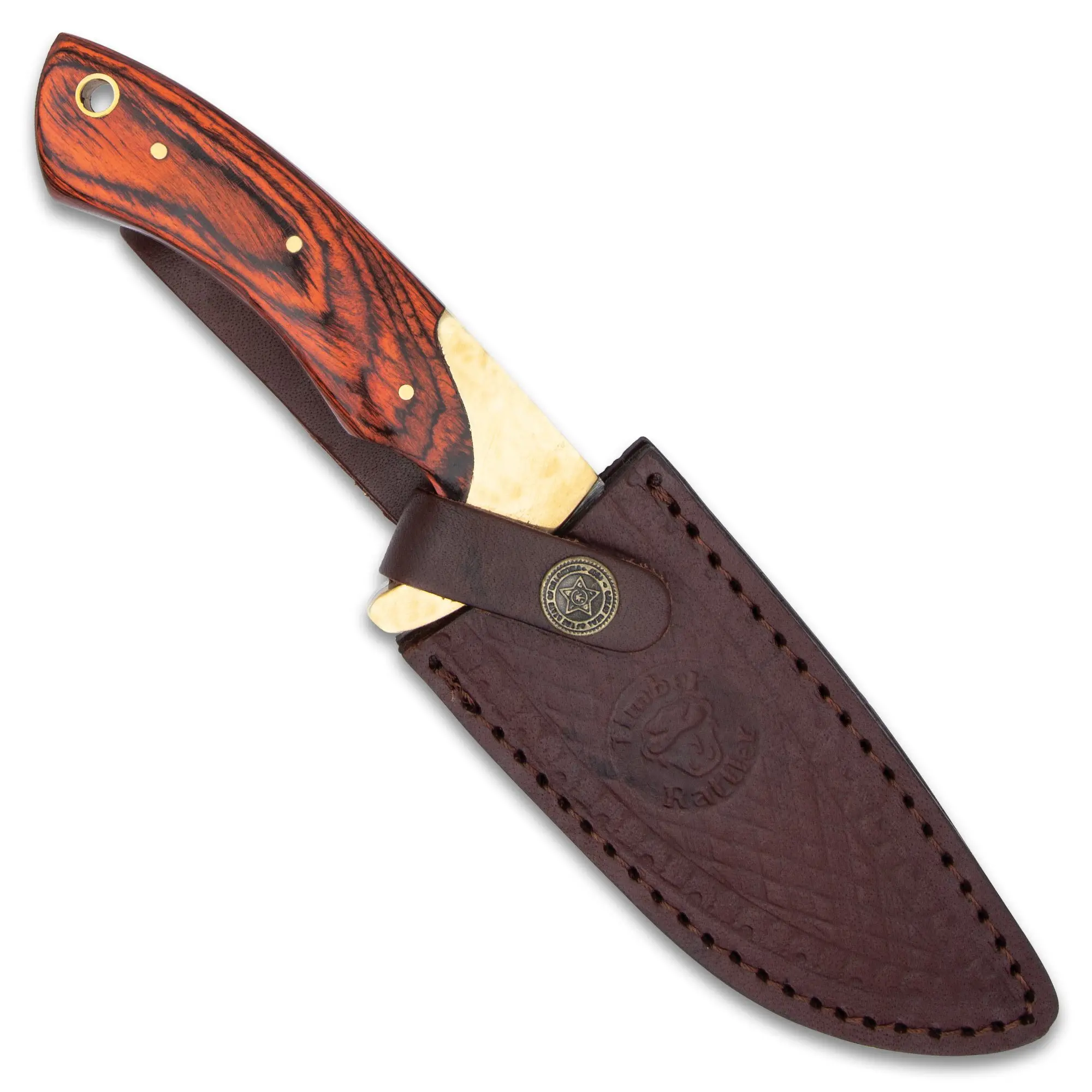 HONED STAINLESS STEEL BLADE: 4 1/2"" full-tang blade built for precision and durability.CLASSIC WOODEN HANDLE: Provides a sturdy, ergonomic grip with timeless appeal.BRASS-PLATED GUARD AND PINS: Adds durability and a touch of elegance to the design.GENUINE LEATHER SHEATH: Protects the blade and ensures convenient carry on your belt.PERFECTLY COMPACT: 9 3/4"" overall length, ideal for everyday carry and outdoor use.
