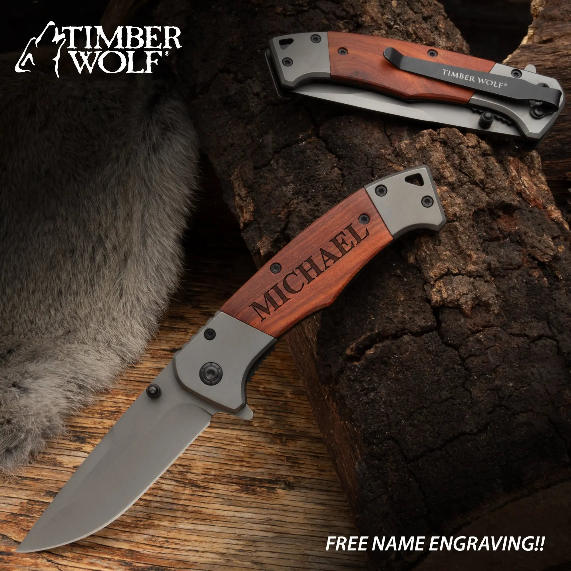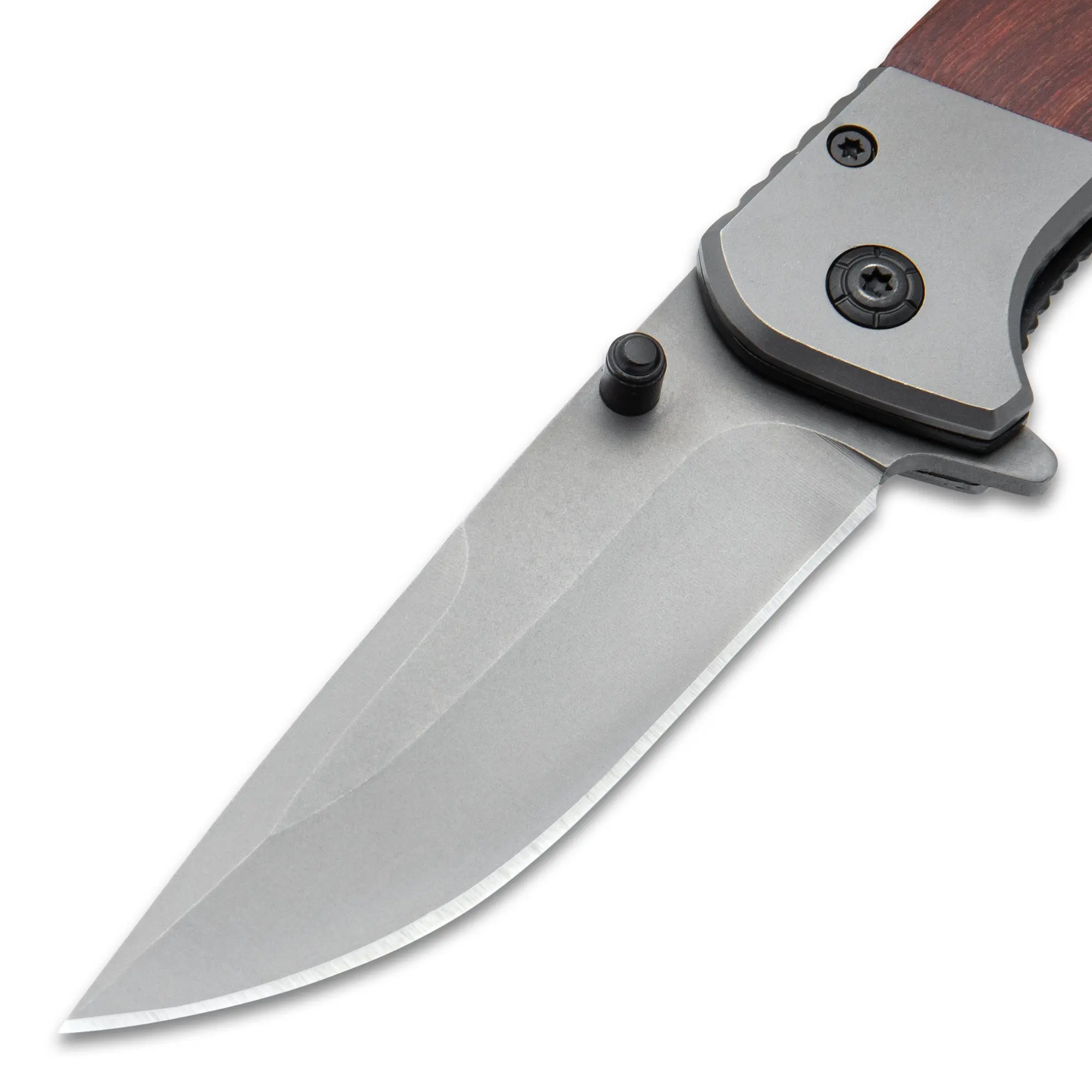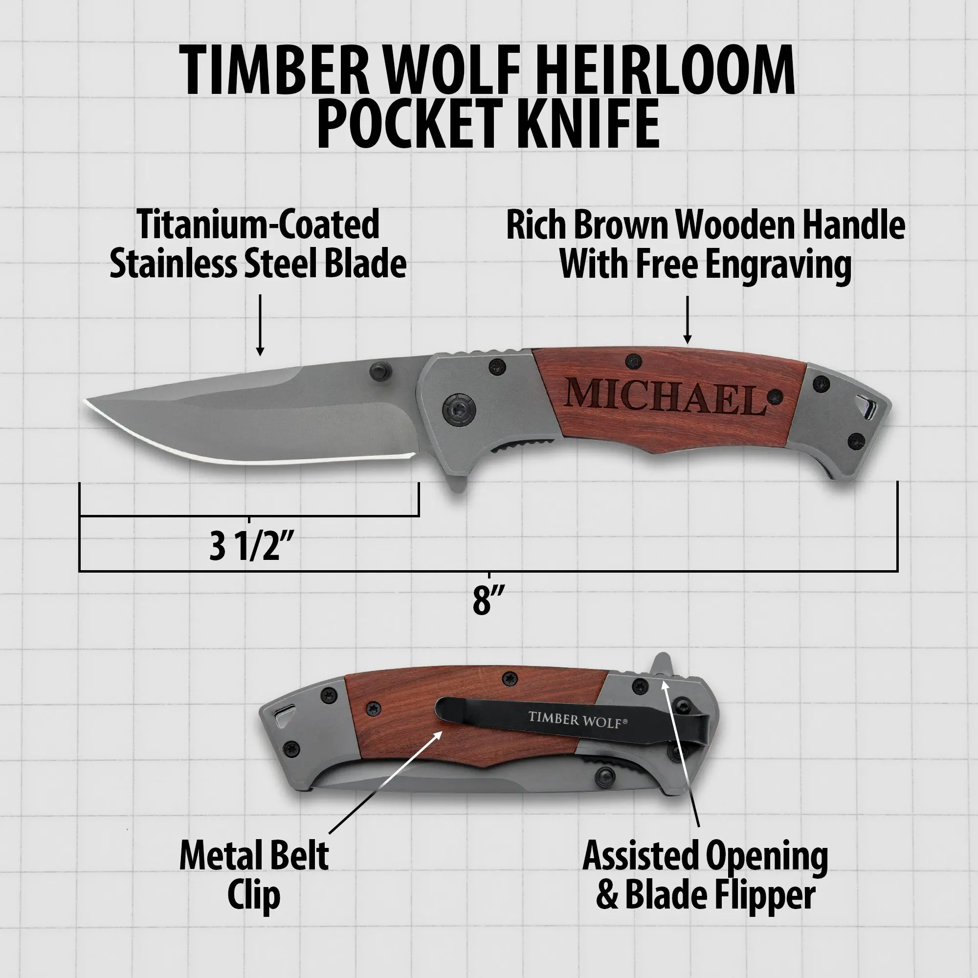 ASSISTED OPENING BLADE:The 3 1/2” titanium-coated stainless steel blade deploys fast with flipper or thumb stud.CLASSIC WOOD HANDLE:Warm brown wood scales with grey steel bolsters offer comfort and style.ENGRAVING READY:Customize with engraving to create a meaningful gift or personal touch.COMPACT CARRY SIZE:Folds to 4 1/2” and includes a stainless steel clip for easy pocket storage.RELIABLE EVERYDAY PERFORMANCE:Built with durable materials for consistent daily use.