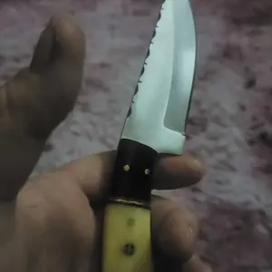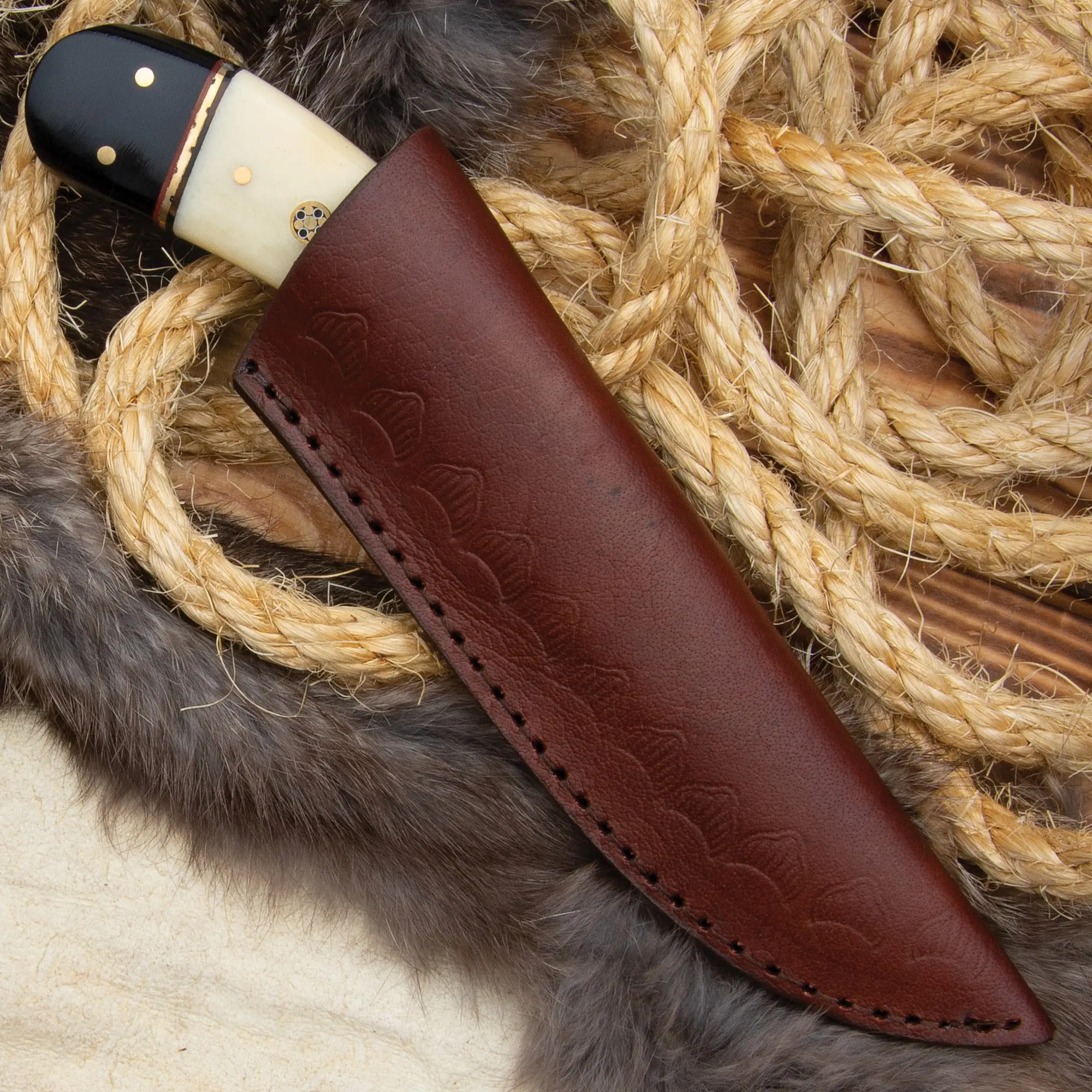 FULL-TANG STAINLESS STEEL BLADE:4” blade with spine file work for cutting performance and detailing.BONE HANDLE SCALES:White and natural bone offer a timeless look and secure grip.DECORATIVE SPACERS:Hand-filed accents and polished pins add visual appeal.MANAGEABLE SIZE:At 7 3/4” overall, it’s well-balanced and easy to carry.LEATHER SHEATH INCLUDED:Comes with a belt sheath for protection and convenient access.