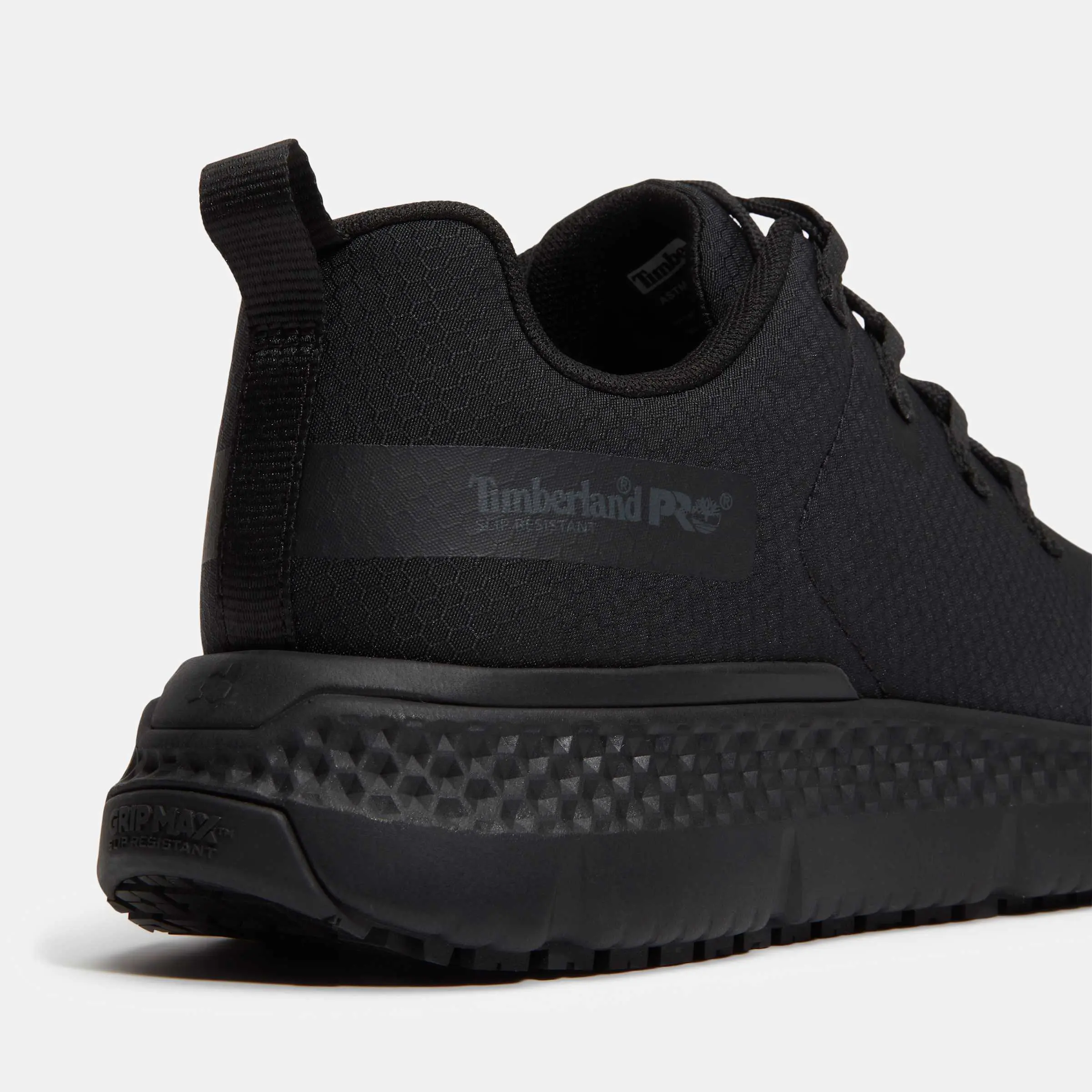Designed on a women's specific last to help provide comfort in industrial environments, our Timberland PRO® Power Shift work sneakers help offer a whole new level of performance. Their metal- and mutilation-free, durable yet breathable, ripstop nylon uppers have been treated with a 3M Scotchgard® fabric protector to help repel liquids and block stains on and off the clock. We added our unique Timberland PRO® 24/7 Comfort System™ that meets rigorous worksite demands while helping reduce foot fatigue by helping support your arch and cushioning every step, flexible cement construction, and lightweight Hover Spring™ foam midsoles designed for even more comfort, durability, and flexibility. It includes a Microban antimicrobial treatment for odor control. Finally, our unique GripMax™ rubber outsoles help provide slip resistance by channeling away liquids such as oil, grease, and water for underfoot performance.