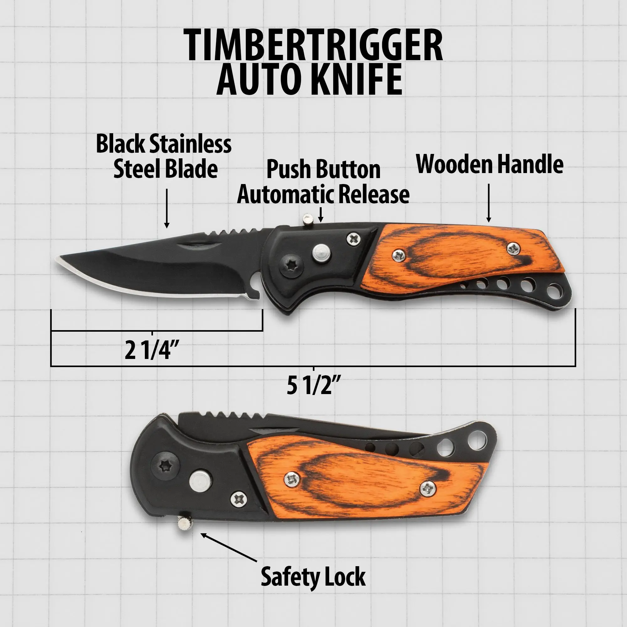 Measuring 5 1/2” overall with a 2 1/4” blade, this TimberTrigger Auto Knife is perfect for discreet everyday carry. Its size ensures it fits comfortably in any pocket or bag, making it an ideal companion for those who value portability without compromising on functionality.