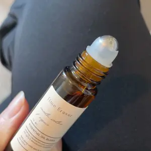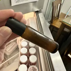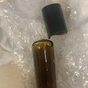 Tiny roller dark glass bottle..cute. Nice smell as it coolly glides out. Not thick at all when it comes out, but it's there... you can feel it.