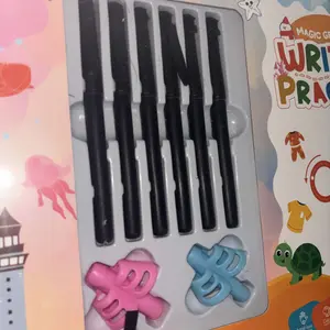 These work great! 6 pens, 6 work books, and the ink disappears in about 5-10 mins! Got these for my baby brother, and I'm hoping this makes writing more fun for him! The pencil grips are also awesome to help kids hold a pencil/pen correctly. Soft, and comfortable grip!