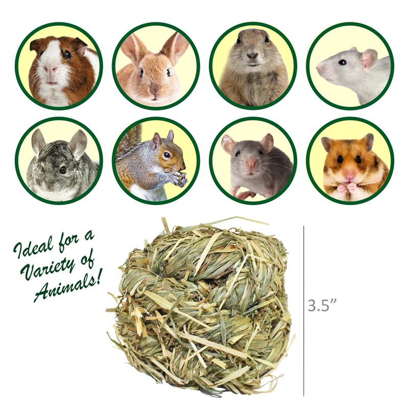 Natural Timothy woven ball is the ultimate combination of treat and toy. Healthy Timothy hay is woven into a 3 1/2 inch wide play ball. Your pet will 'munch' and play at the same time! Hand Crafted for rodents for a treat that’s not only nutritious, but fun too.