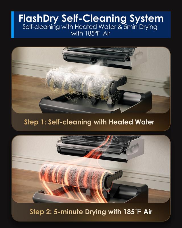 ·Flashdry Self-Cleaning System: Using heated fresh water to effectively dissolve stains from the pipe to the brush roller, and then using 85℃ hot air to effectively dry every part of the machine. Truly worry-free after use.