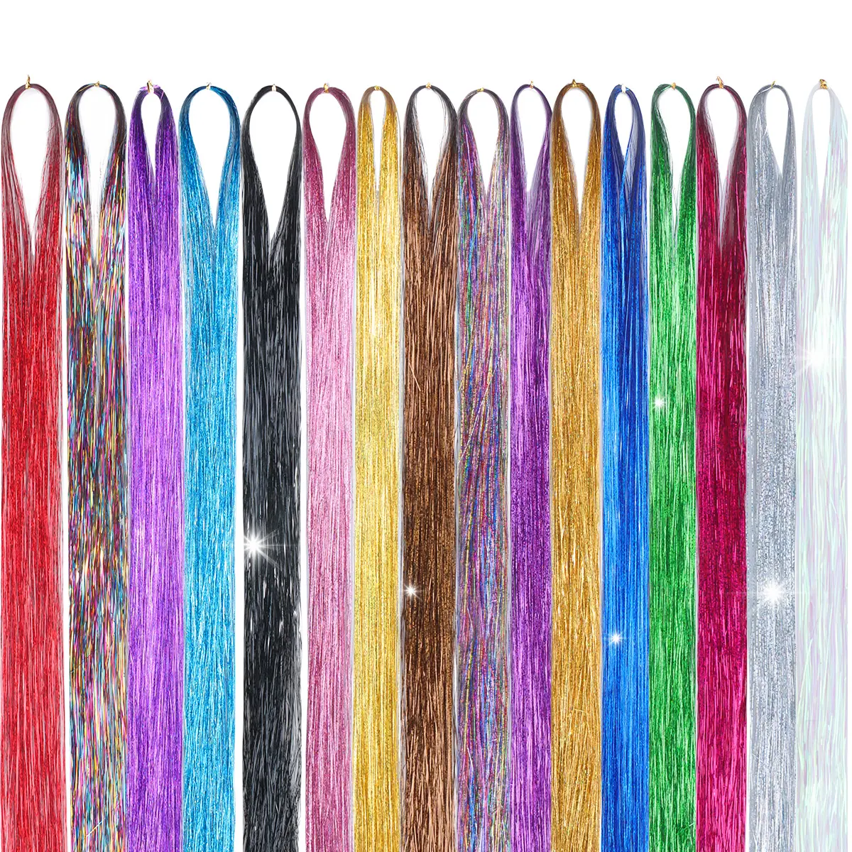【16 Sparkling Colors】: Hair Tinsel safe heat resistant made by high quality polyester fiber hair tinsel. Black, Silver, Bright White, Golden Brown, Gold, Champagne, Pink, Rose Red, Red, Treasure Blue, Sky Blue, Purple, Light Purple, Green. A variety of colors meet the various styles of fairy hair