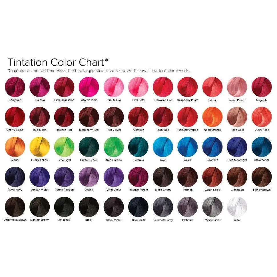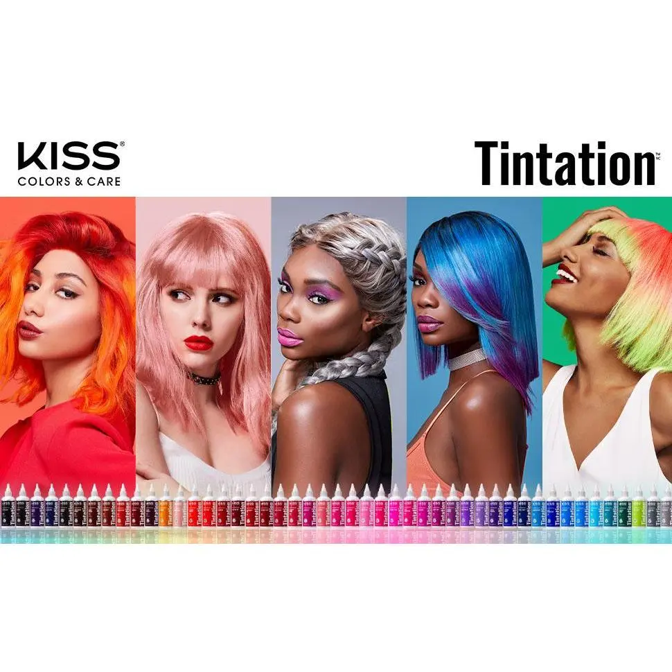 Give in to the Tintation! Semi-permanent hair color from Kiss, for those who wish to be bold with their hair, without compromising hair health.  54 mixable, vivid colors to choose from, the color possibilities are endless!  Tintation is formulated with natural ingredients to ensure your hair is not only vibrant, but also healthy and conditioned! To maximize treatment benefits, our first ingredient is Aloe Vera Water instead of distilled water.  Aloe Vera Water contains Proteolytic enzymes and Amino acids that repairs dead cells on the scalp and maintains an optimal pH balance. Aloe Vera Water also has a similar chemical make up to Keratin, the primary protein found in hair. Other conditioning agents include: