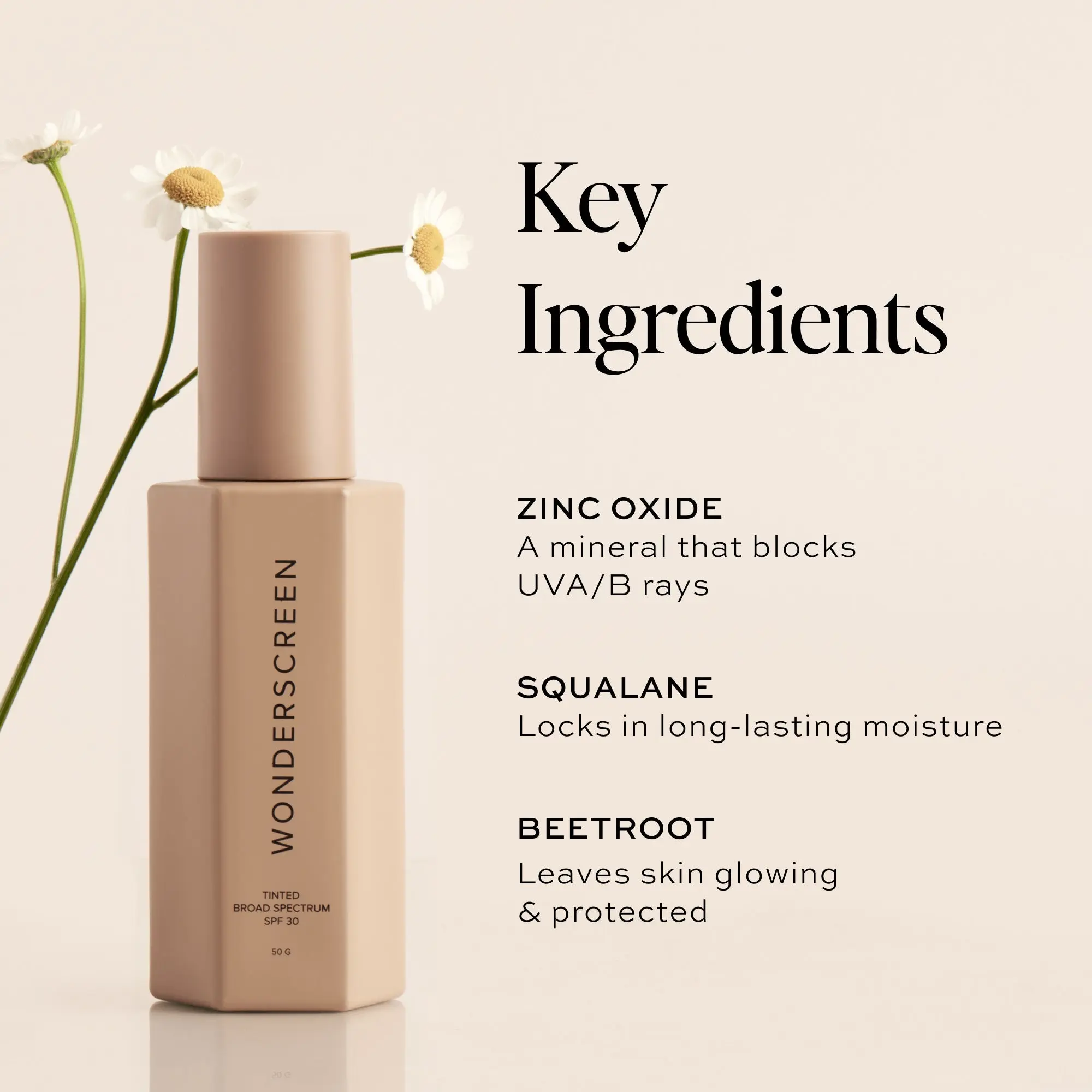 Tinted Glow Wonderscreen SPF 30 should be applied each morning and reapplied every two hours.