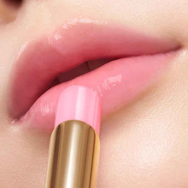 Transforms as you apply, melting from gelée in the stick to conditioning oil on the lips. Lightweight.