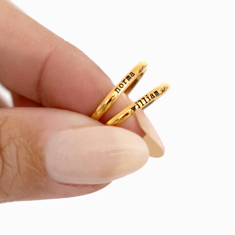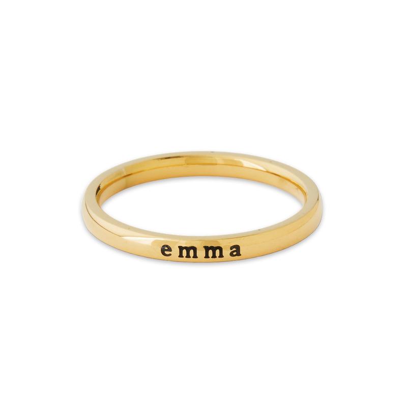 This sleek, minimal ring is perfect for layering or wearing alone, featuring your name, an inspirational word or the name of your loved one in a delicate, modern font.