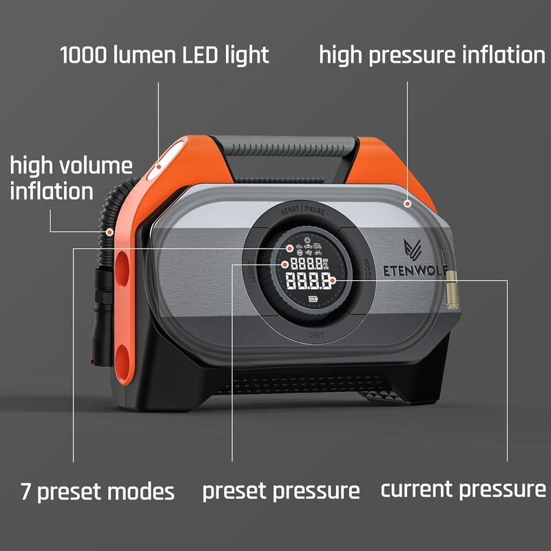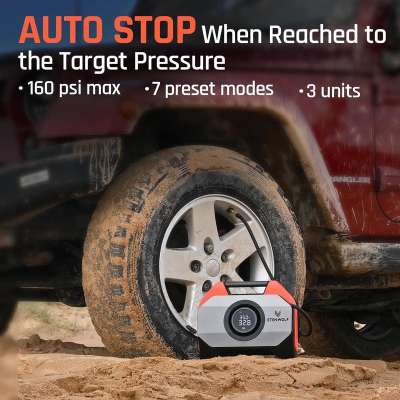 ·ETENWOLF Vortex S6 cordless air compressor excels at inflating heavy-duty vehicles quickly, such as pickups, trucks, off-road vehicles, not to mention regular cars, bicycles, balls, pool floats, and air mattresses(Not for SUPs)