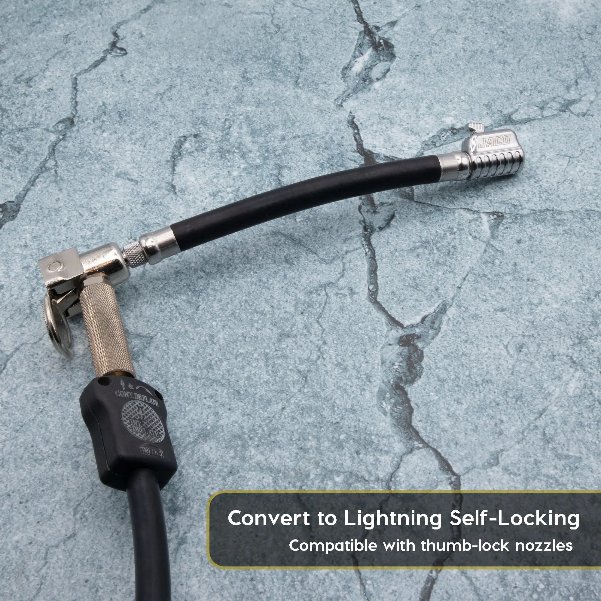 Supercharge the utility of your portable tire inflator with our Lightning S2X-Series self-locking + quick-release hose extension. It's designed to replace the standard screw-on, clip-on, or thumb-lock tire valve connectors on the air hose of your tire inflator, offering a more convenient and efficient inflating experience.