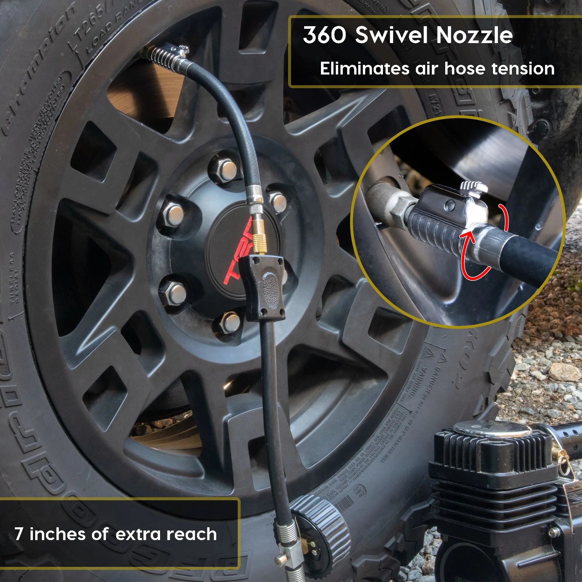 ·360 Swivel End: Our patented lock-on tire inflator attachment features a straight angle nozzle that freely rotates 360 degrees in either direction, eliminating frustrating air hose tension while providing the perfect angle to access the tire valve stem on your car, truck, motorcycle, RV, trailer, bike, etc.