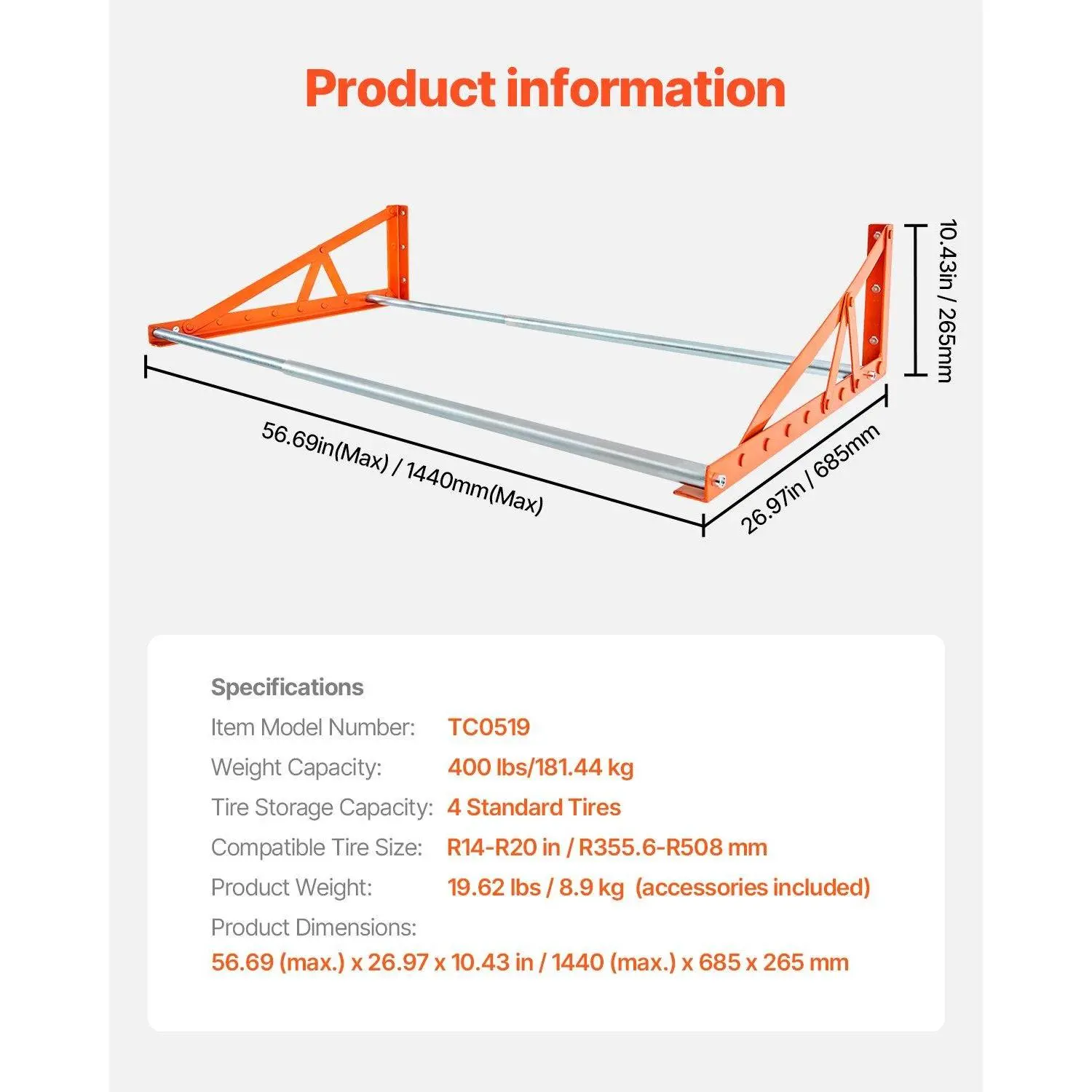 ·Flexible Length Adjustment: The adjustable support bars of this wall-mounted tire rack easily extend from 31-inch to 56-inch, adapting to various wall sizes and meeting your different storage needs.