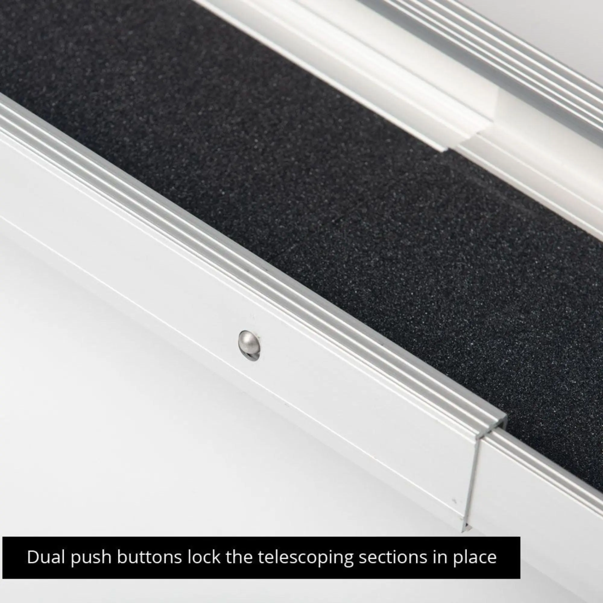 The Titan Ramps 4' to 7' Telescoping Aluminum Wheelchair Ramp is the perfect solution for enhancing your mobility both at home and on the go. This ramp easily expands from 4 feet to 7 feet in length, providing a smooth transition for wheelchair access over rises. Whether you're navigating steps at home, visiting friends, or heading out to public spaces like restaurants or stores, this ramp makes accessibility effortless.Designed with portability in mind, the ramp quickly collapses and fits into an included easy-carry bag, allowing for convenient storage and transport. Its lightweight aluminum construction offers exceptional strength, supporting up to 600 lbs, making it ideal for most standard wheelchairs. The high-traction surface ensures a secure grip, giving you peace of mind while navigating inclines.Measuring 4' to 7' long and 7.5" wide (6" inside width), the ramp features a 4" inside track, ensuring compatibility with wheelchairs that have aligned front and rear wheels. The sections lock securely in place once expanded, preventing any movement during use. Whether you're facing a short or taller rise, the Titan Ramps Telescoping Ramp provides a reliable, safe, and convenient mobility solution.Make everyday outings and visits easier and more accessible with this versatile, heavy-duty wheelchair ramp.