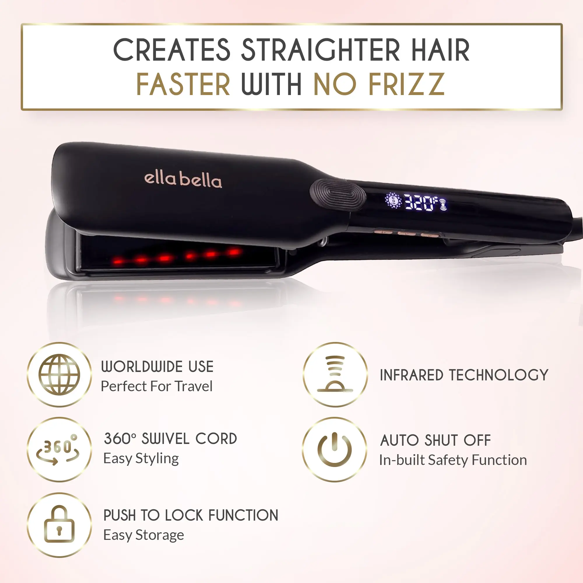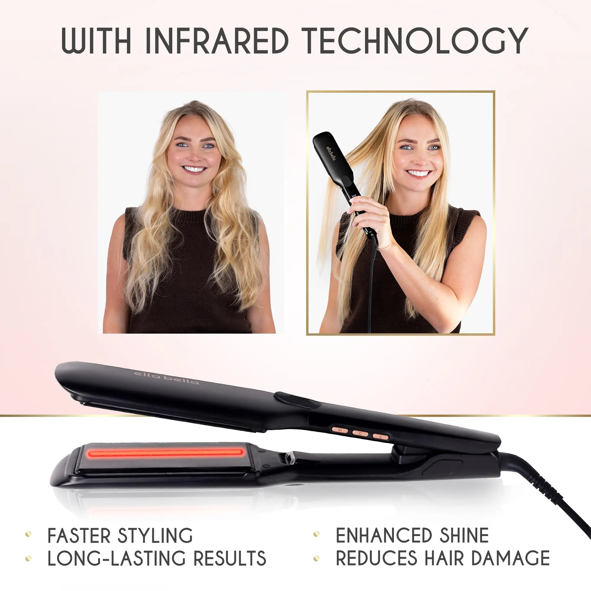 This flat iron is great! It heats up incredibly fast. The infrared technology seems to lock in moisture, so my hair stays straight and smooth all day without needing touch-ups. It feels comfortable to hold. My hair feels soft, shiny, smooth, and looks so much healthier.